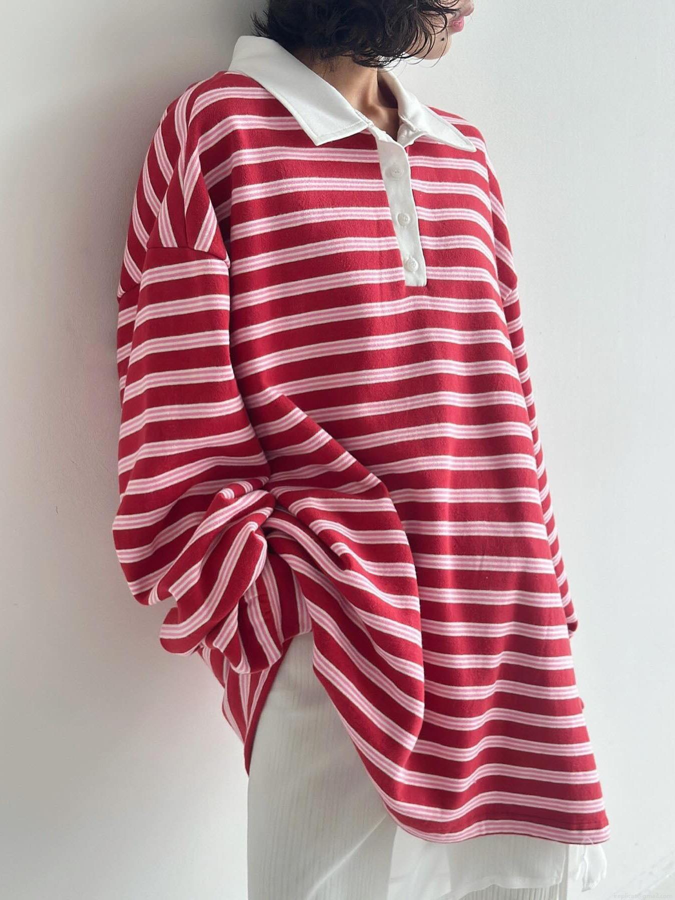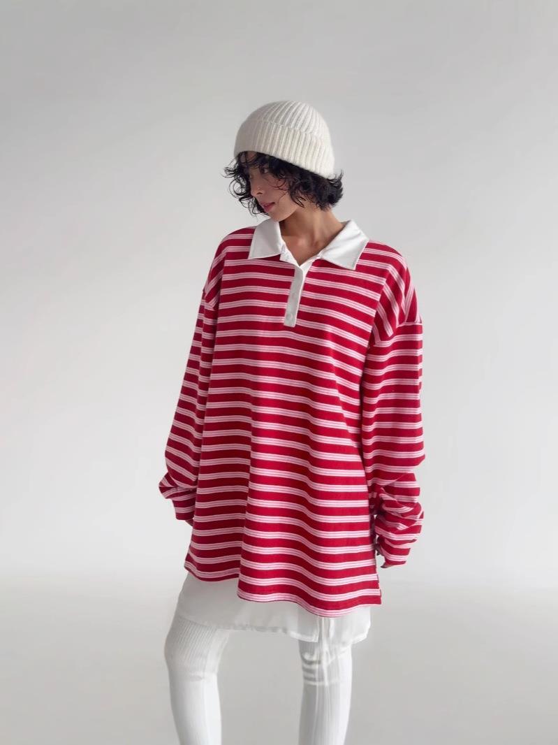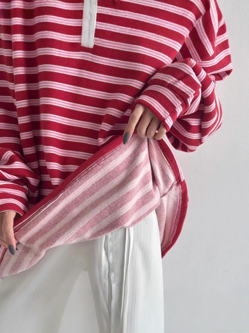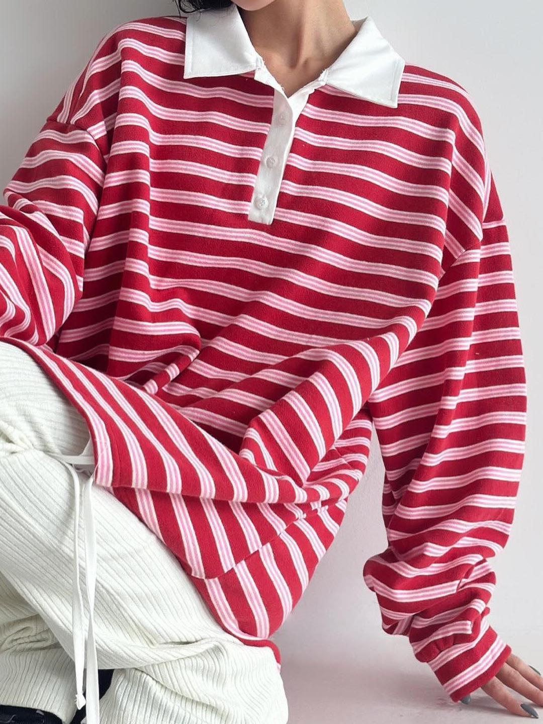 • Women's American Retro Striped Long Sleeve Polo Shirt Fleece Lined Oversized Cotton Blend T-Shirt Casual Streetwear Pullover Top