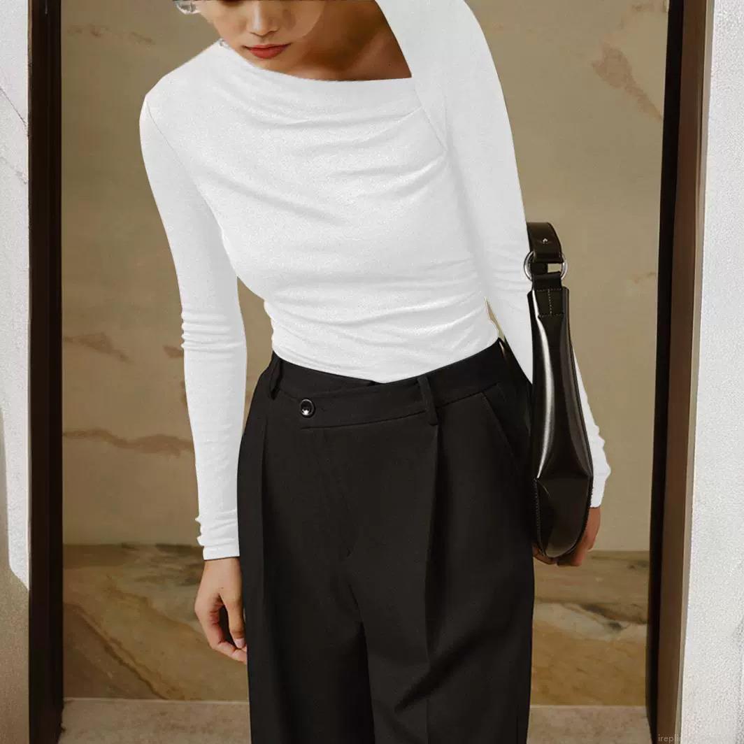 • Women's Asymmetric Neck Long Sleeve Slim Fit Tee Elegant Solid Color Knit Top For Commuting Office Wear High Elastic Polyester Cotton Blend Basic T-Shirt Modern Aesthetic Blouse