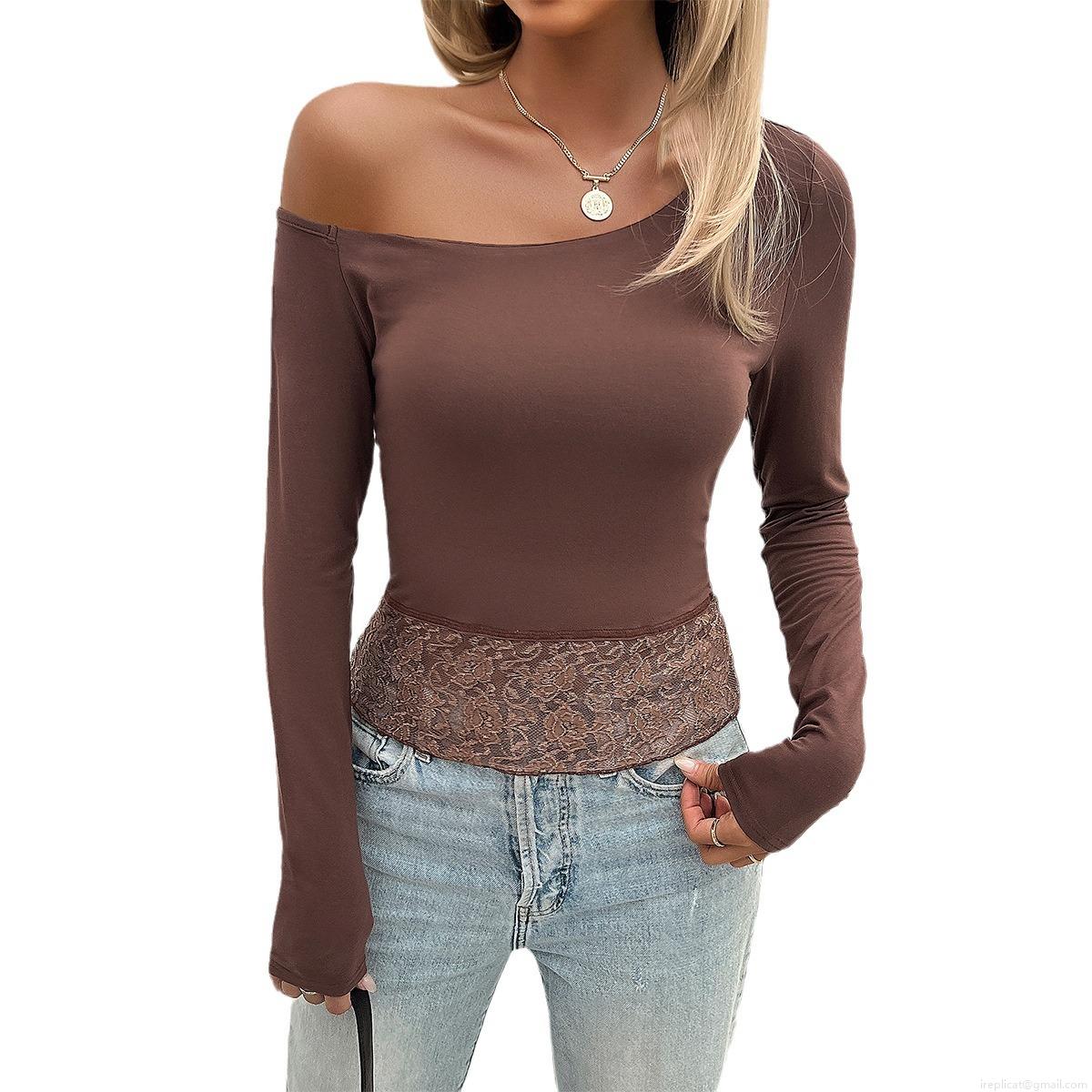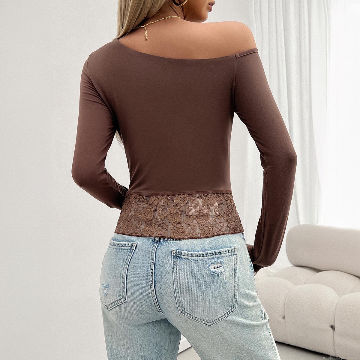 • Women's Asymmetric One Shoulder Long Sleeve T-Shirt Sexy Slim Fit Knit Top With Lace Patchwork Hem Y2K Solid Color Autumn Winter Leisure Shirt