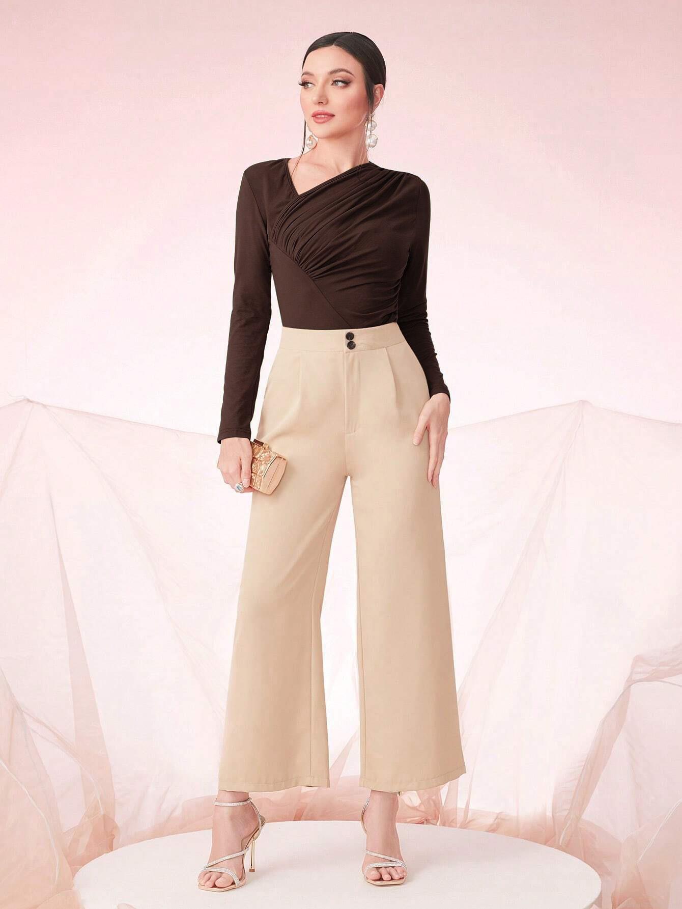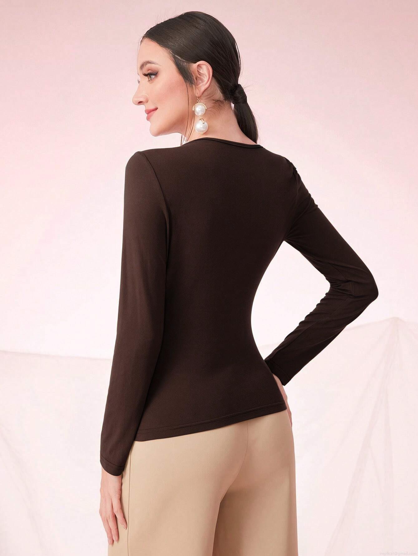 • Women's Asymmetric Ruched Long Sleeve T-Shirt Elegant Oblique Neck Slim Fit Solid Color Base Layer Top Coffee Brown Viscose Elastane Pullover For Office Ladies
