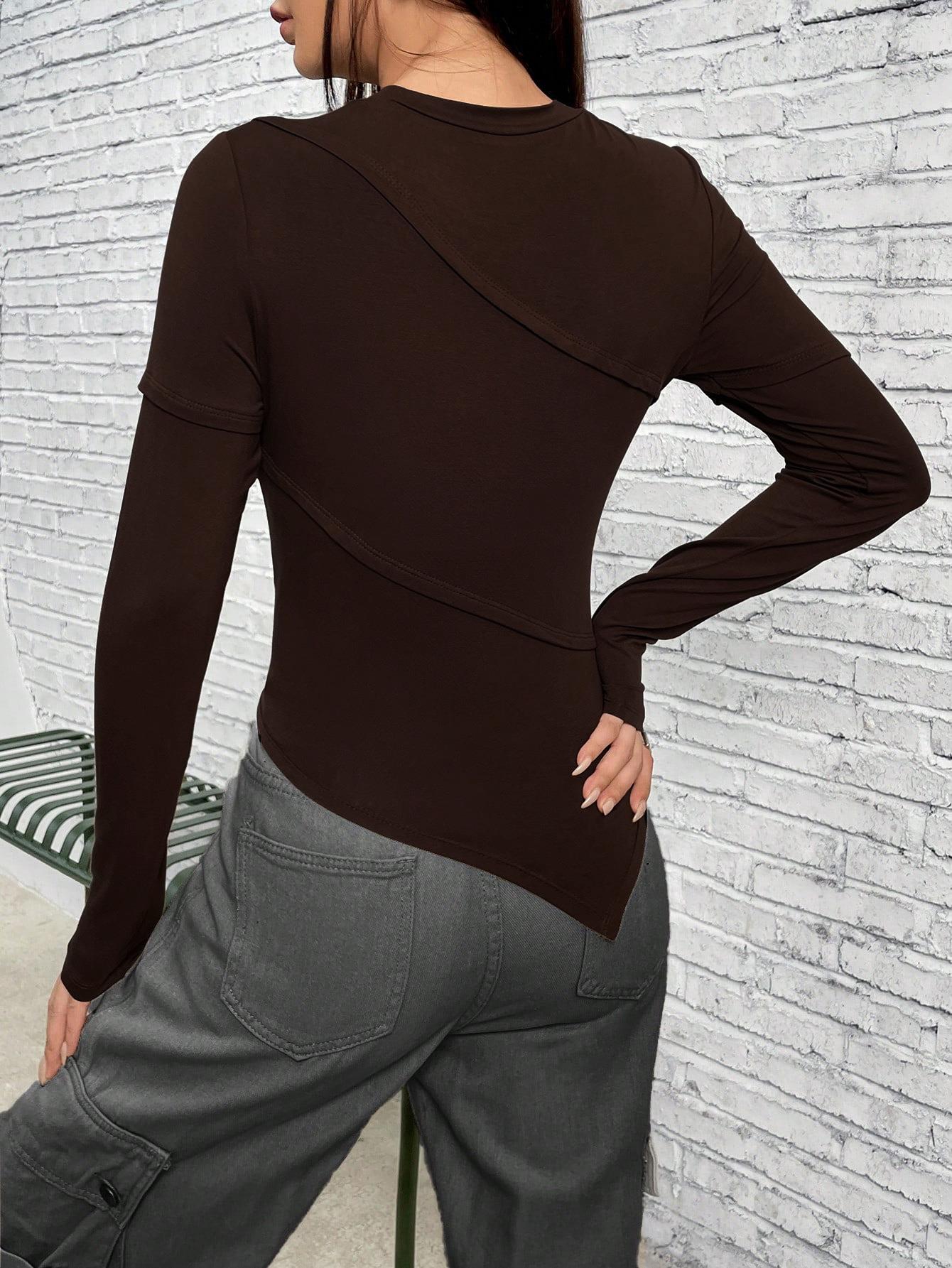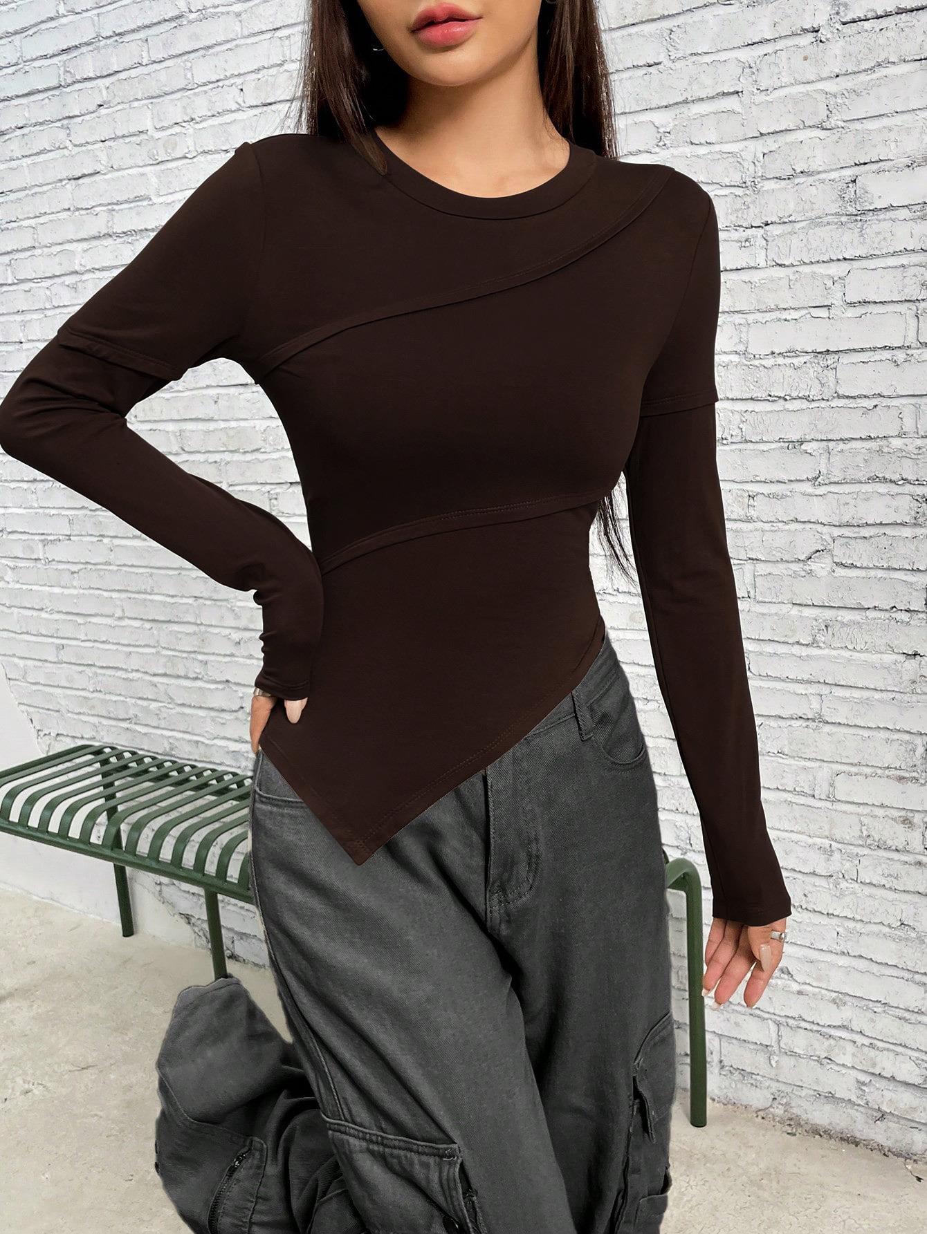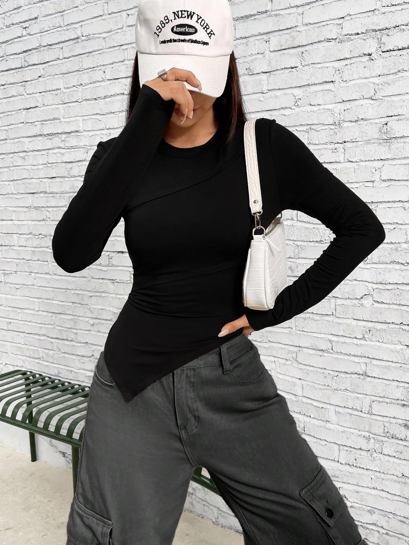 • Women's Asymmetrical Hem Long Sleeve T-Shirt Slim Fit Cotton Blend Ribbed Knit Top Crewneck Casual Streetwear Solid Color Blouse
