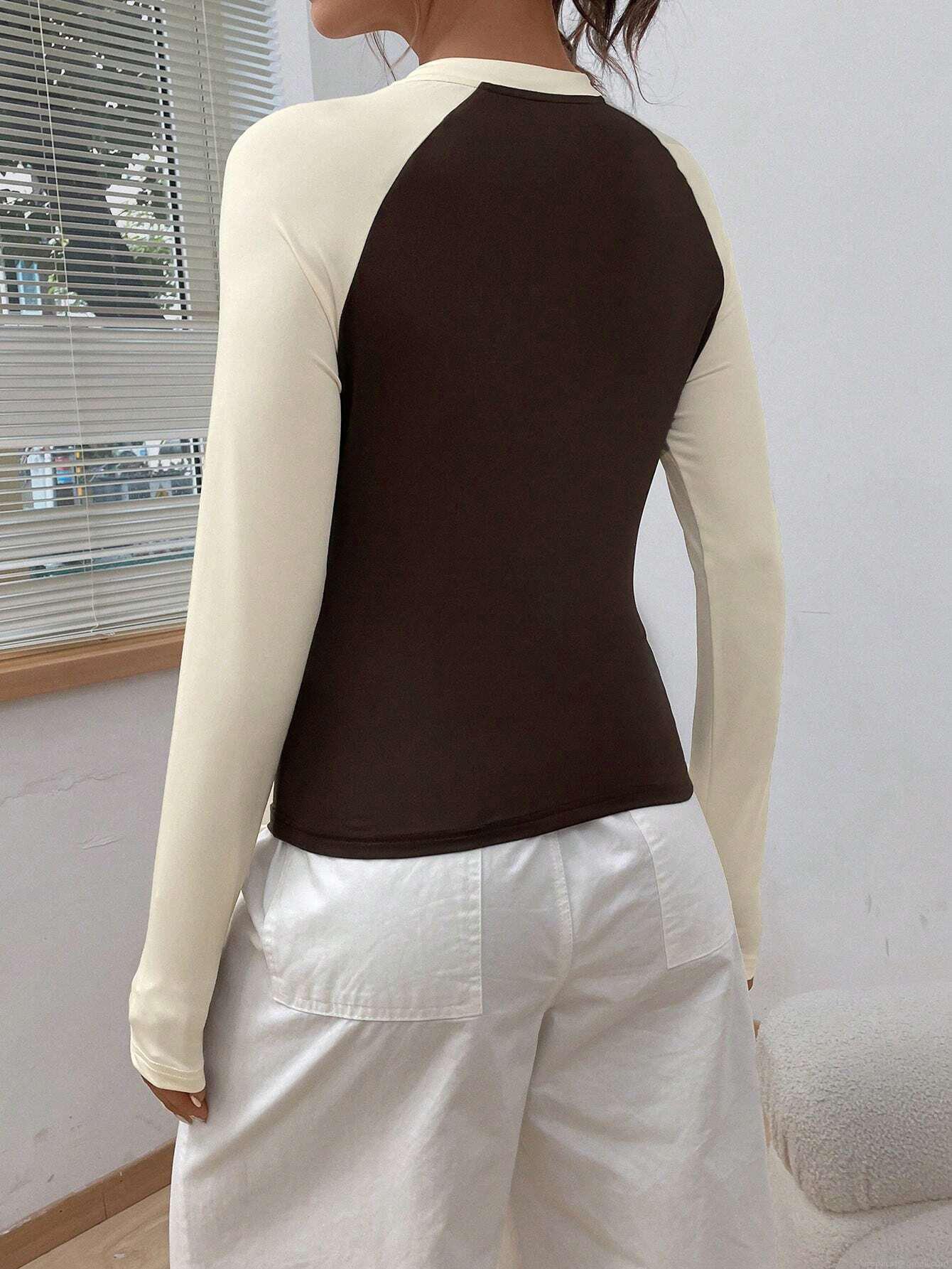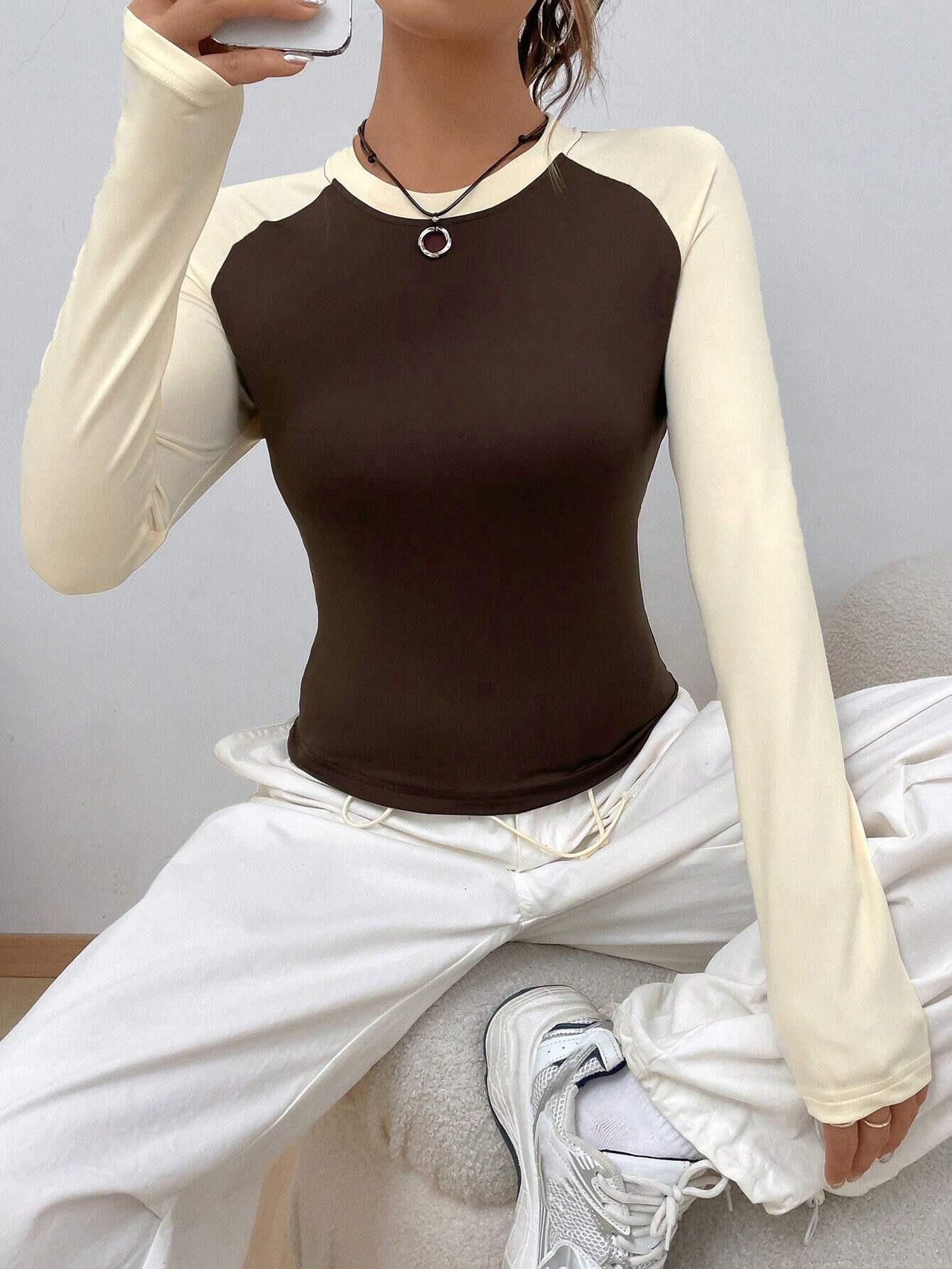 Women's Casual Contrast Color Raglan Long Sleeve T-Shirt Slim Fit Round Neck Polyester Blend Base Layer Top For Autumn Winter