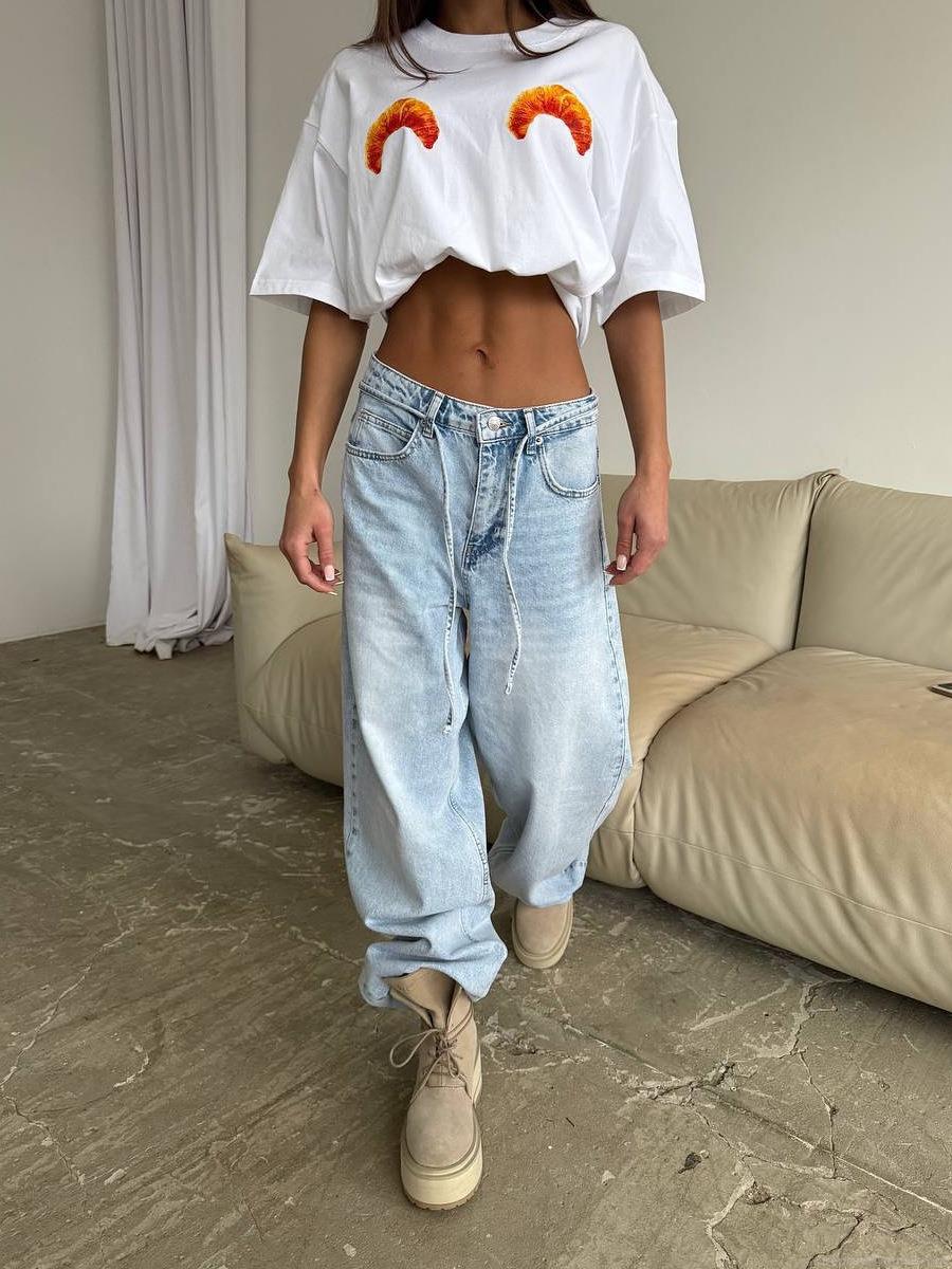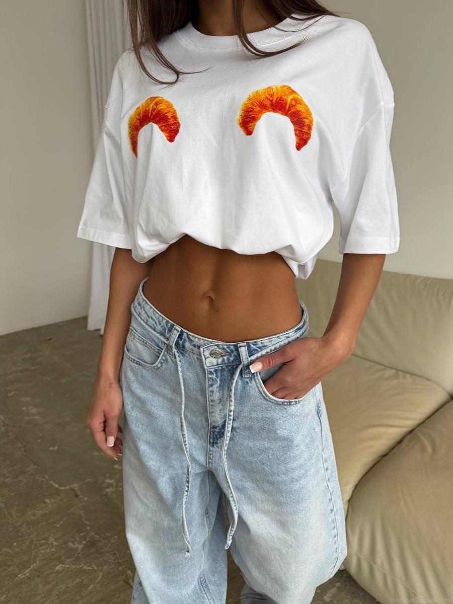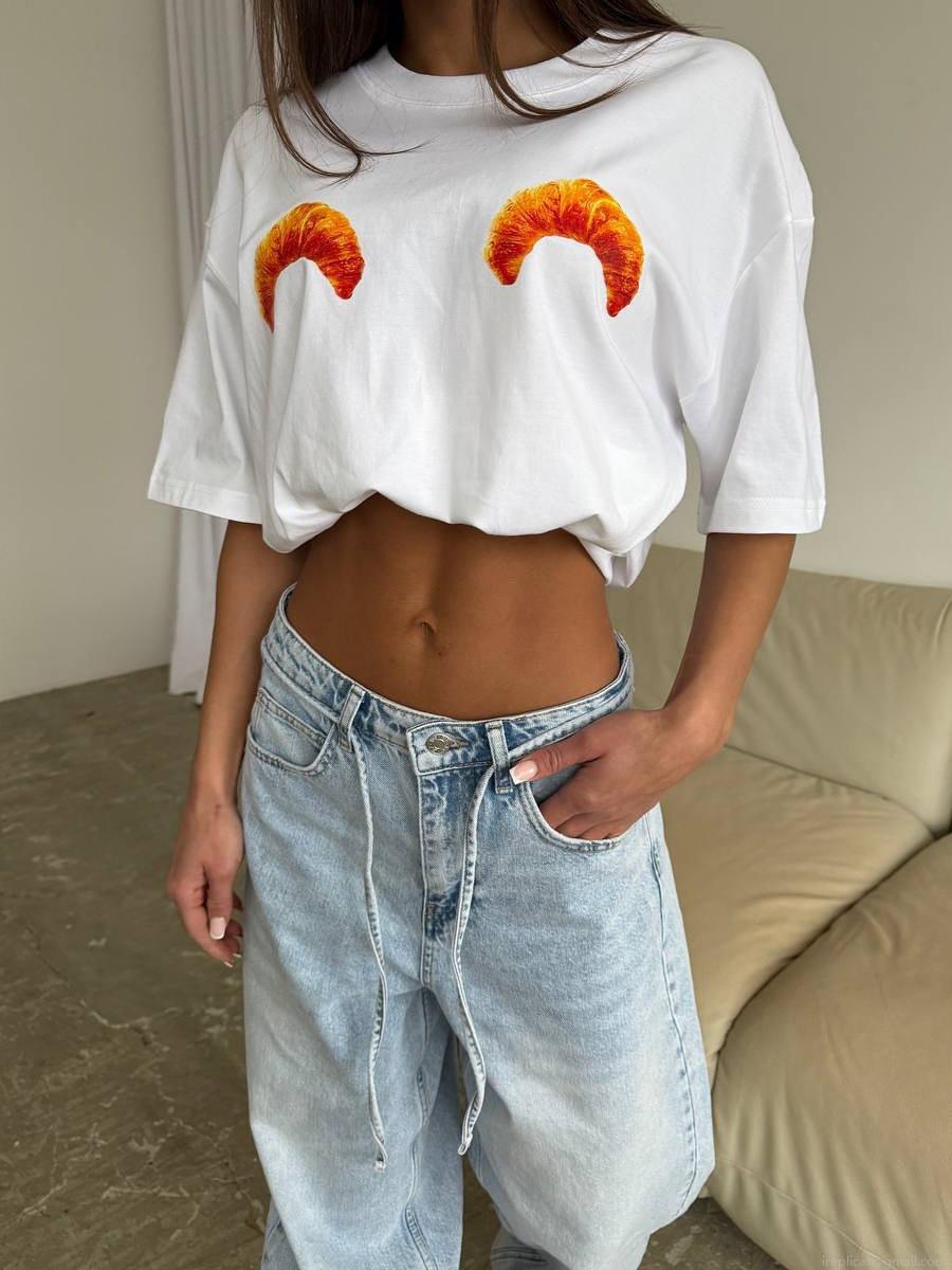 • Women's Casual Cotton Blend T-Shirt Funny Croissant Print Oversized Short Sleeve Drop Shoulder Round Neck Tee Streetwear Loose Fit Summer Top For Women