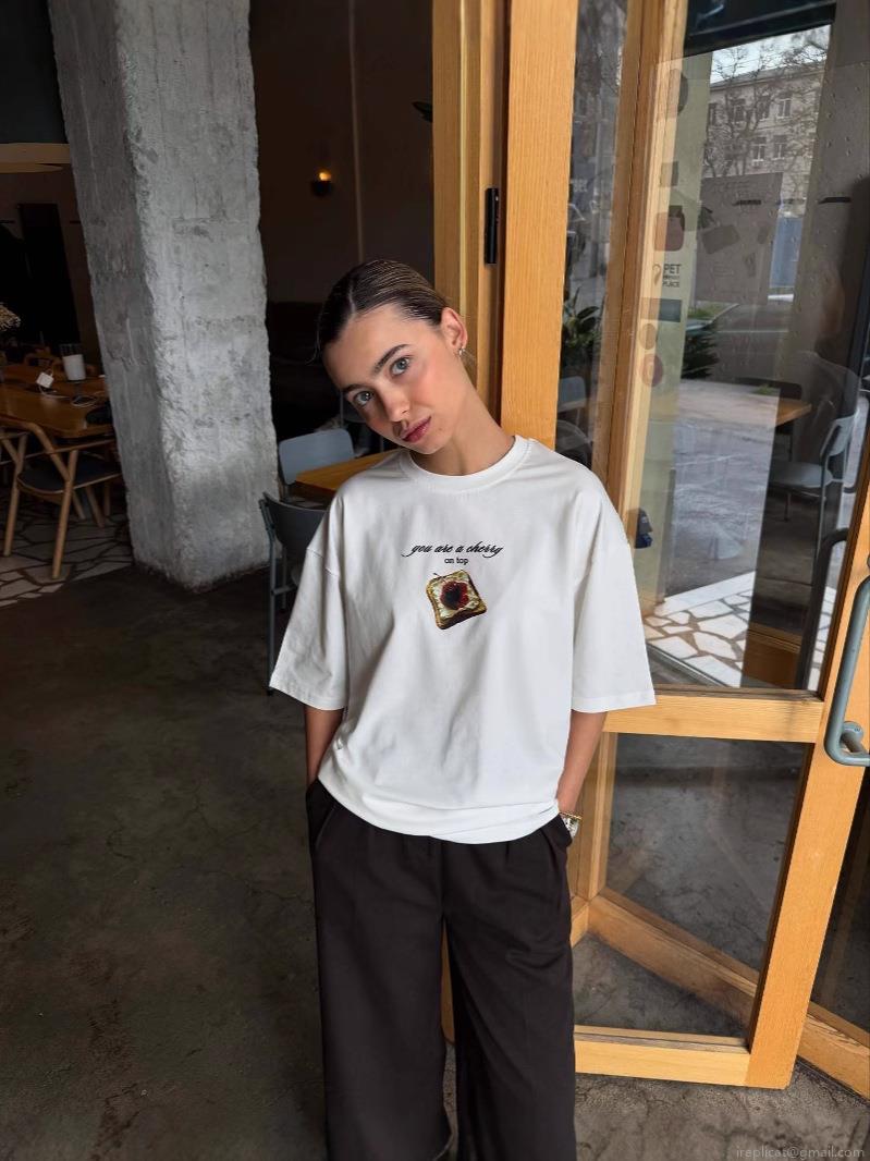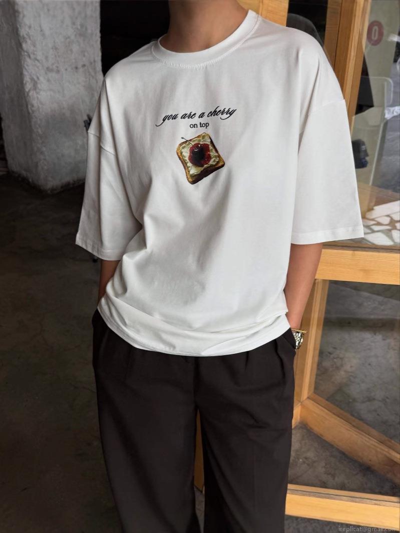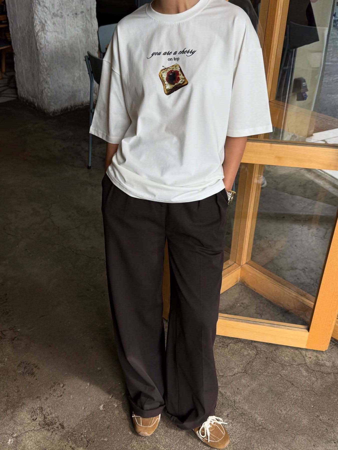• Women's Casual Cotton Blend T-Shirt Short Sleeve Round Neck Cherry Toast Graphic Print American Street Style Loose Fit Top For Summer Daily Wear