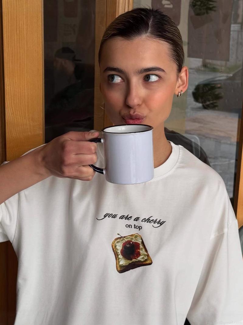 Women's Casual Cotton Blend T-Shirt Short Sleeve Round Neck Cherry Toast Graphic Print American Street Style Loose Fit Top For Summer Daily Wear