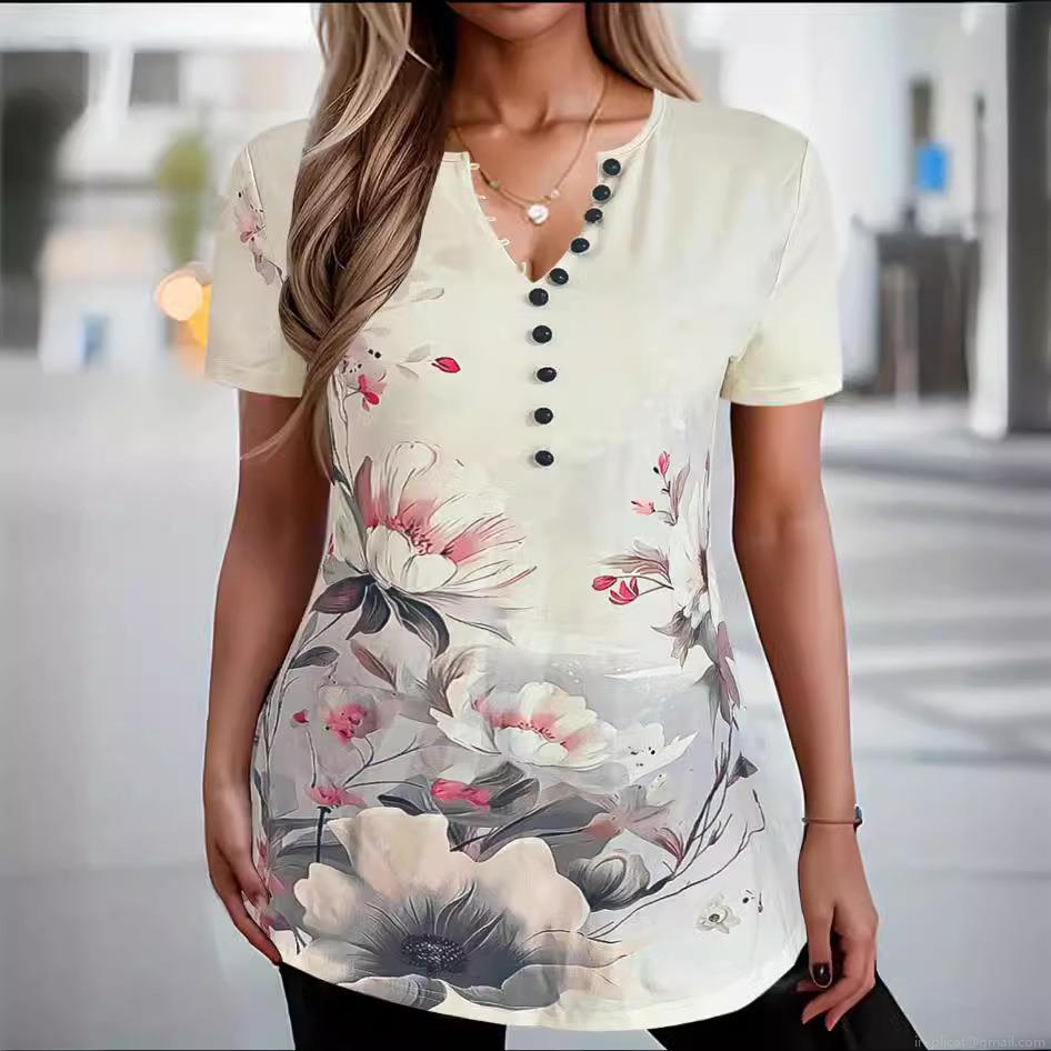 • Women's Casual Floral Print T-Shirt V-Neck Button Front Short Sleeve Loose Pullover Polyester Spandex Top Summer Daily Wear