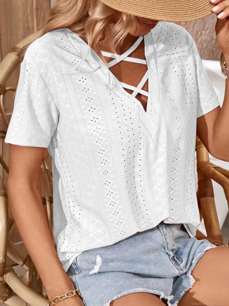 • Women's Casual Hollow Out Lace T-Shirt V-Neck Criss Cross Strappy Loose Fit Breathable Short Sleeve Summer Beach Vacation Top