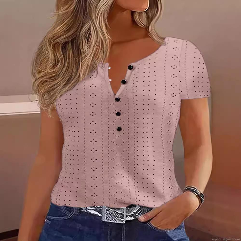 • Women's Casual Hollow Out V-Neck T-Shirt Short Sleeve Loose Fit Polyester Spandex Jacquard Top With Contrast Buttons For Summer Daily Wear