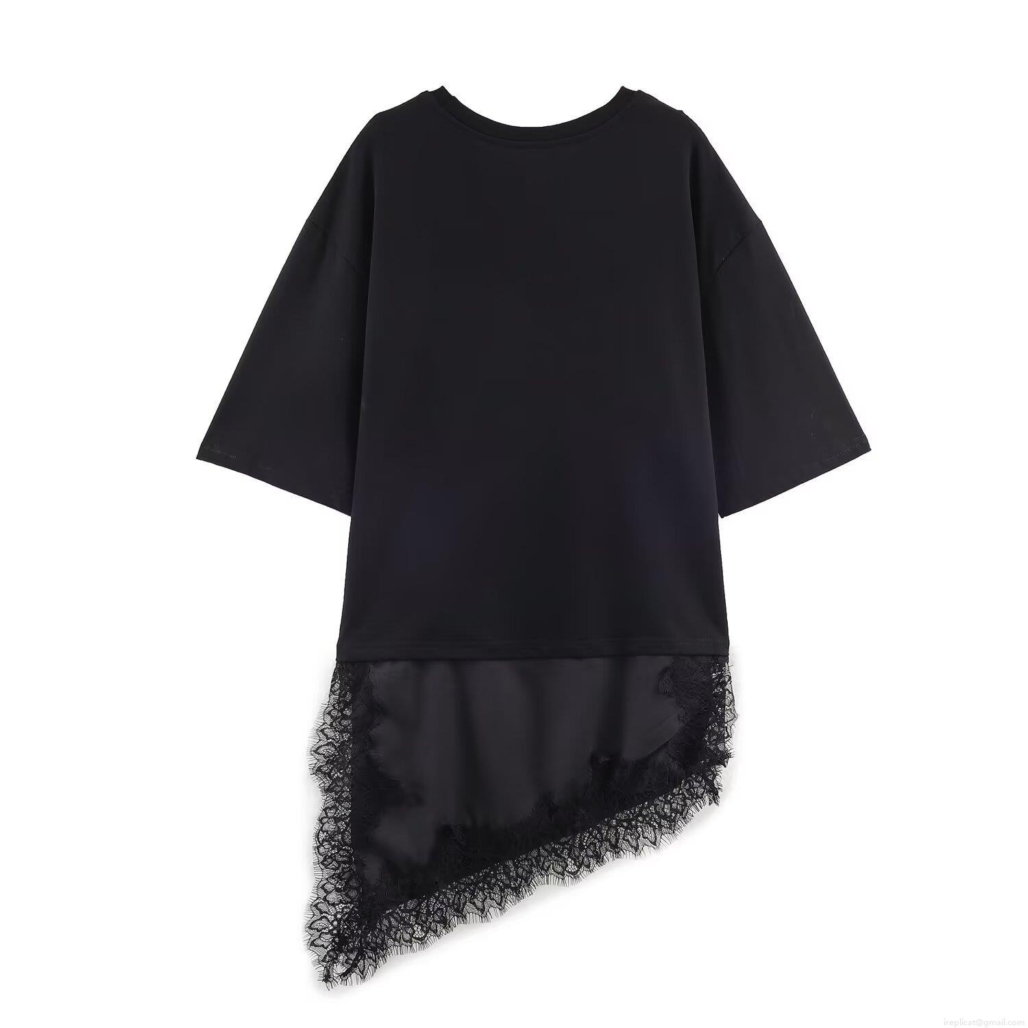 Solid Color, Splice, Lace Decoration, Crew Neck, Asymmetrical Hem