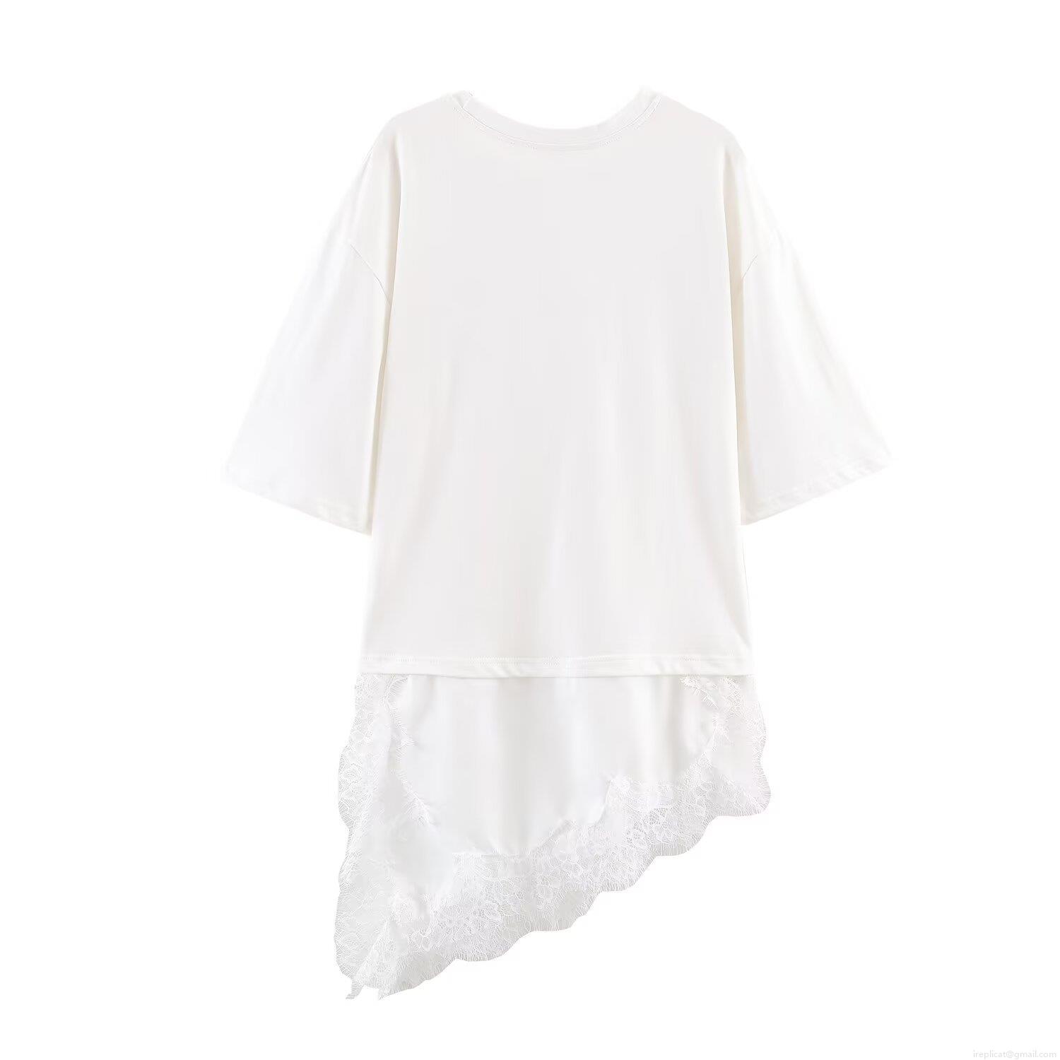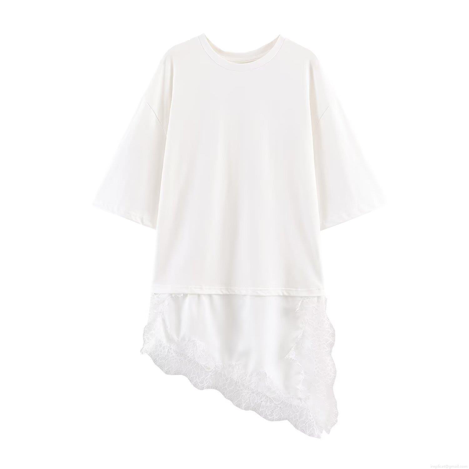 • Women's Casual Lace Splicing T-Shirt Round Neck Short Sleeve Loose Longline Top Asymmetric Patchwork Hem Tee Dress Solid Color Soft Streetwear Polyester Cotton Blend