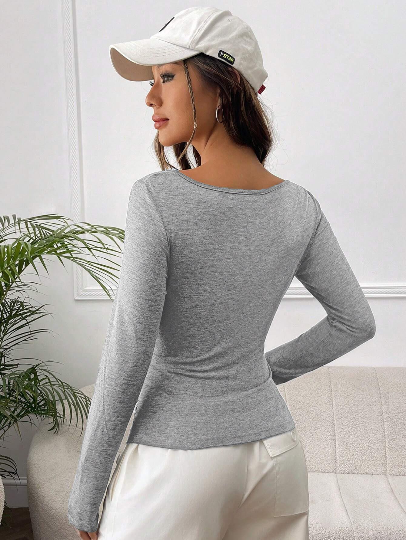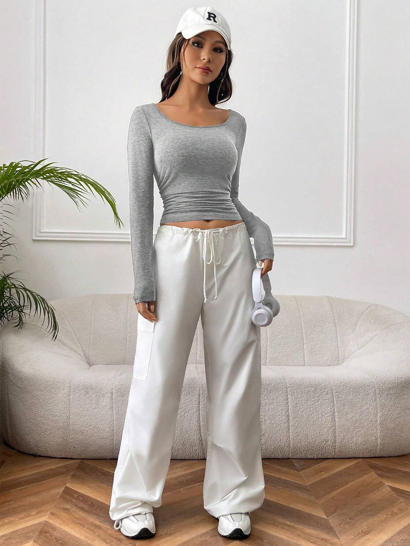 • Women's Casual Long Sleeve Ruched T-Shirt Slim Fit Polyester Elastane Solid Grey Round Neck Crop Top Basic Tee