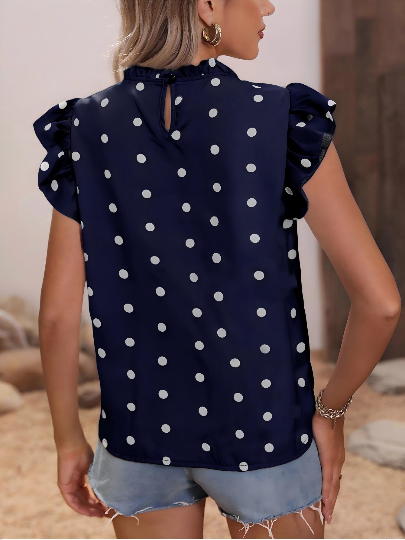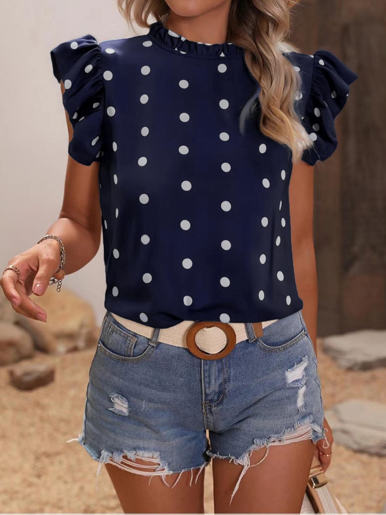 • Women's Casual Polka Dot Print T-Shirt Ruffle Short Sleeve Round Neck Polyester Blouse Summer Beach Vacation Top For Women
