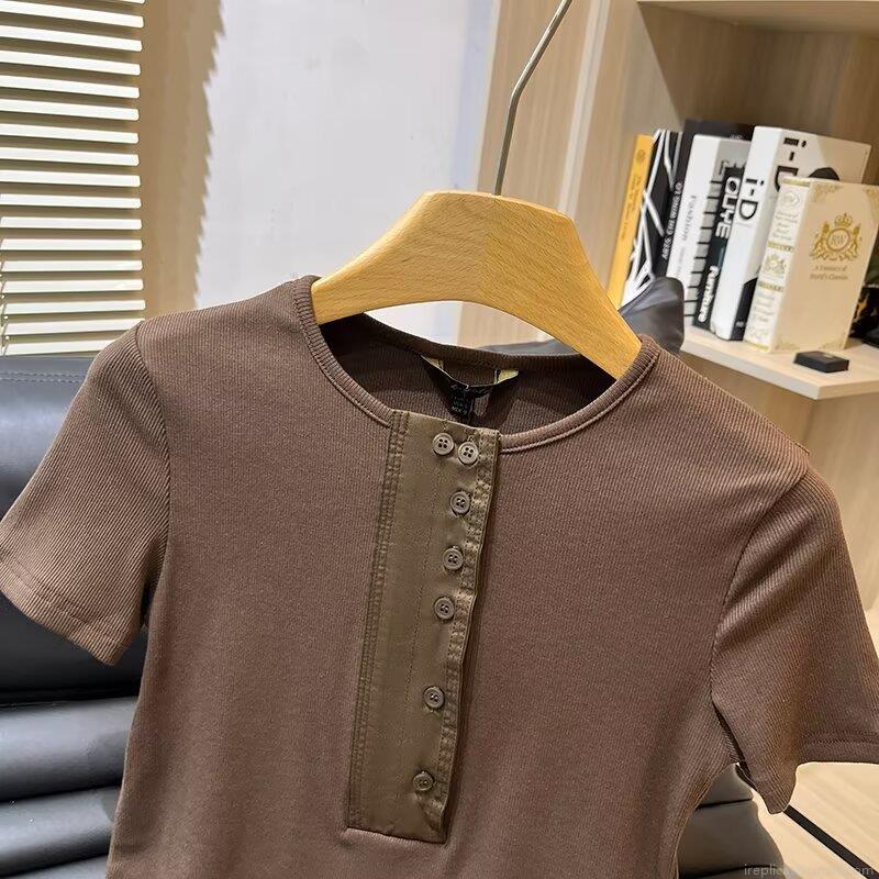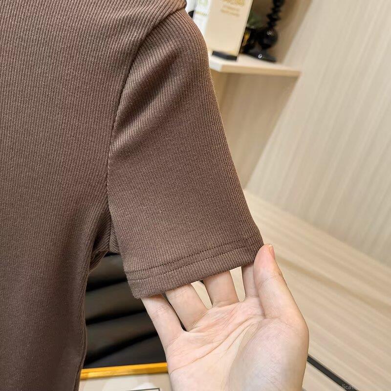 • Women's Casual Ribbed Knit Cotton Blend Short Sleeve T-Shirt Button Up Half Placket Slim Fit Solid Color Round Neck Daily Top Coffee Brown