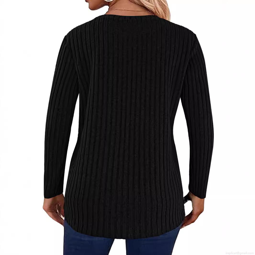 • Women's Casual Ribbed Knit Long Sleeve T-Shirt Round Neck Side Slit Top With Decorative Buttons Solid Color Slim Fit Polyester Spandex Pullover For Daily Wear