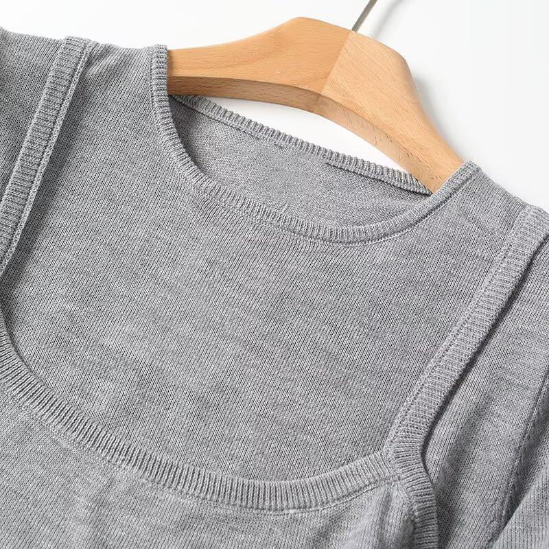 Women's Casual Short Sleeve Knit T-Shirt Loose Fake Two-Piece Layered Square Neck Viscose Nylon PBT Blend Grey Tee Solid Color Summer Autumn Top for Women