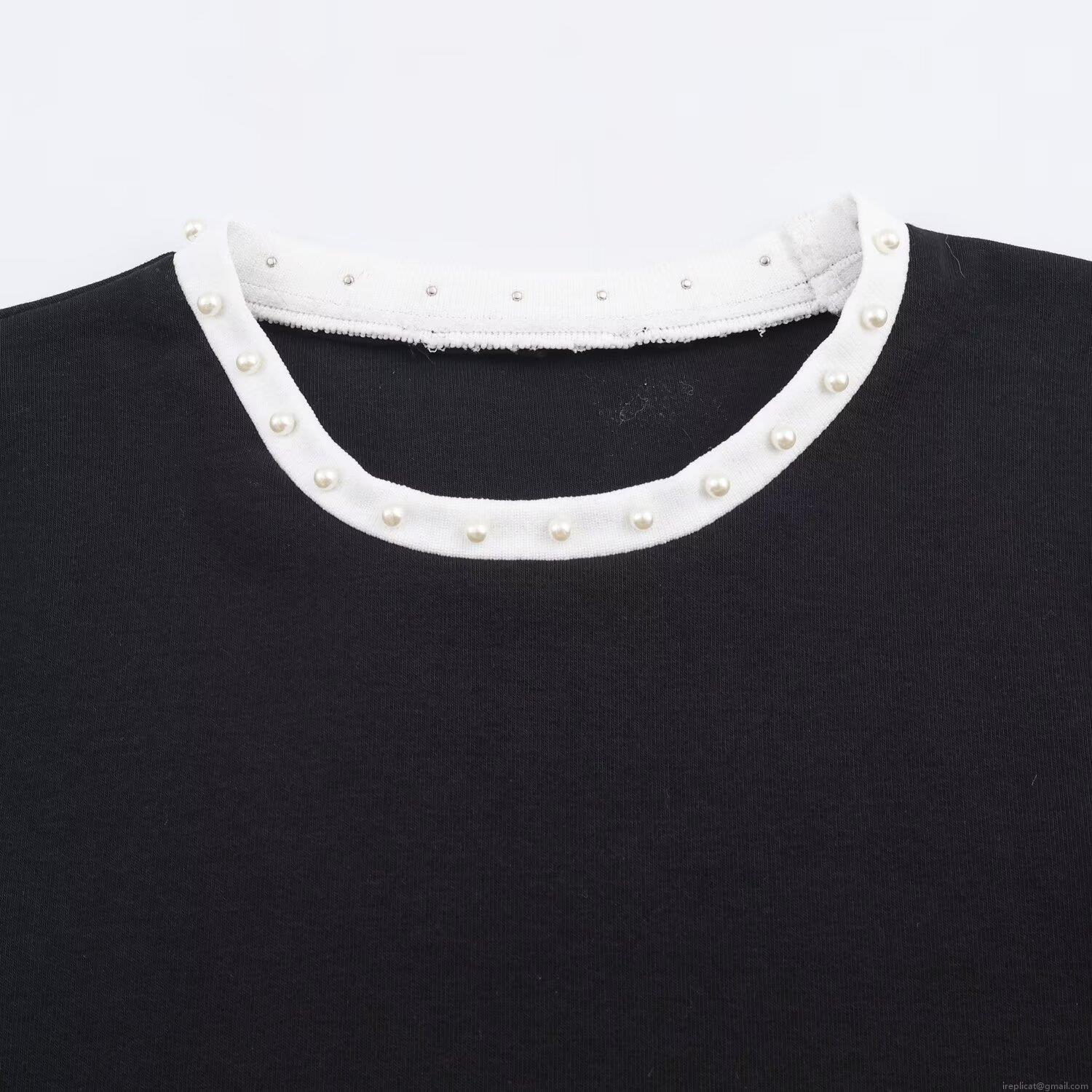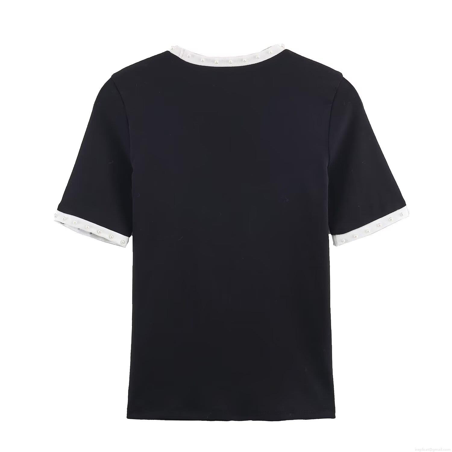 • Women's Casual Slim Fit Short Sleeve T-Shirt With Faux Pearl Beaded Trim Round Neck Contrast Color Patchwork Tee Top For Daily Daily Wear