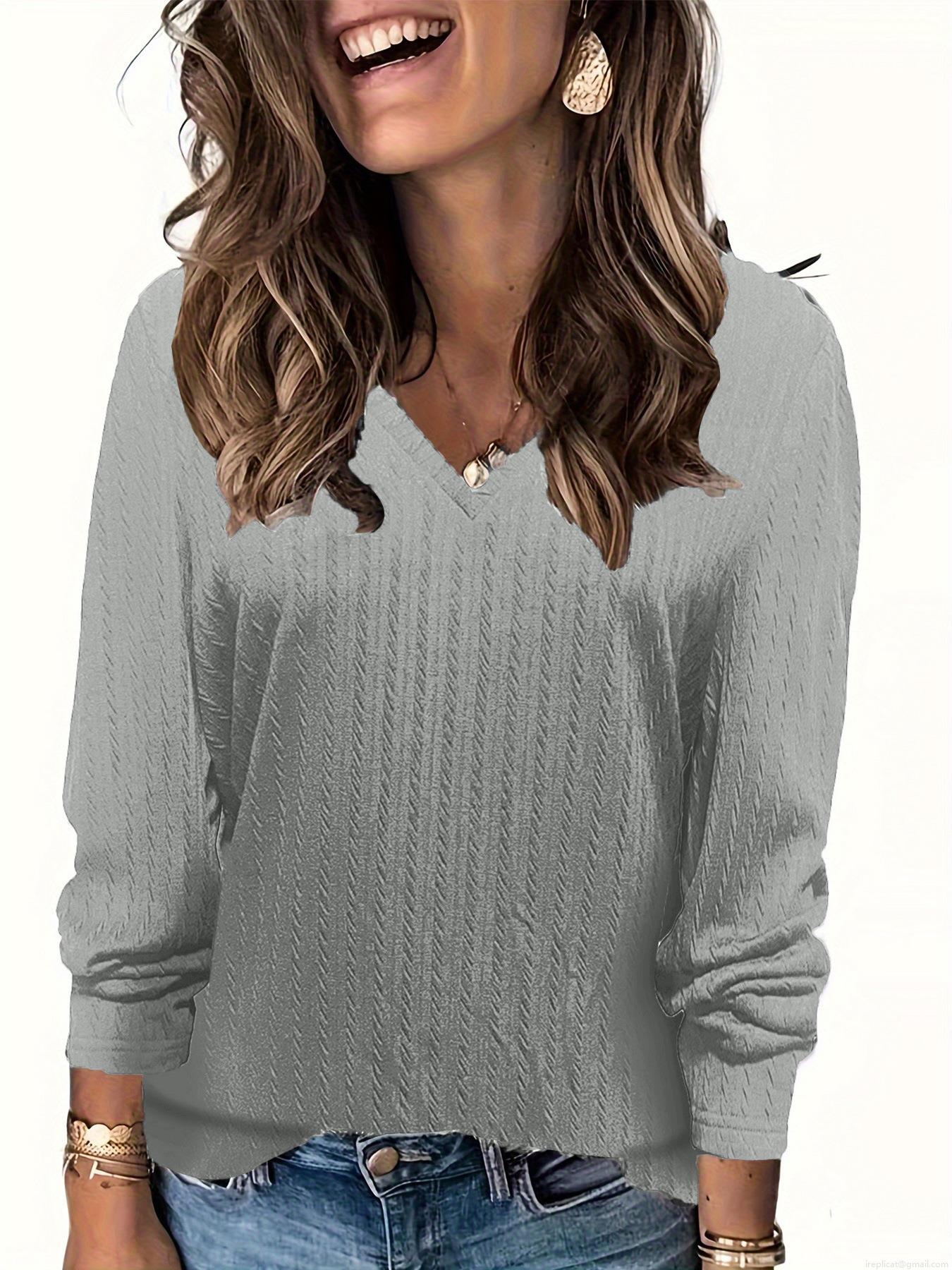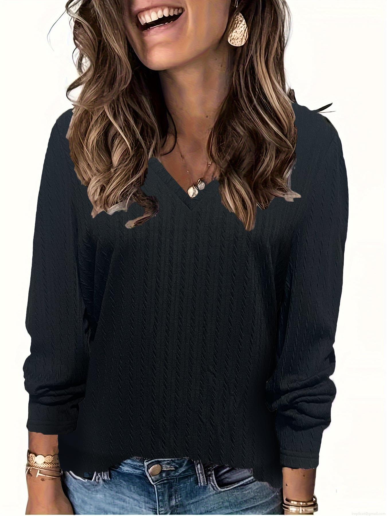 • Women's Casual V Neck Long Sleeve T-Shirt Cotton Blend Ribbed Knit Loose Fit Plain Pullover Tops Autumn Winter Ribbed Texture Shirts