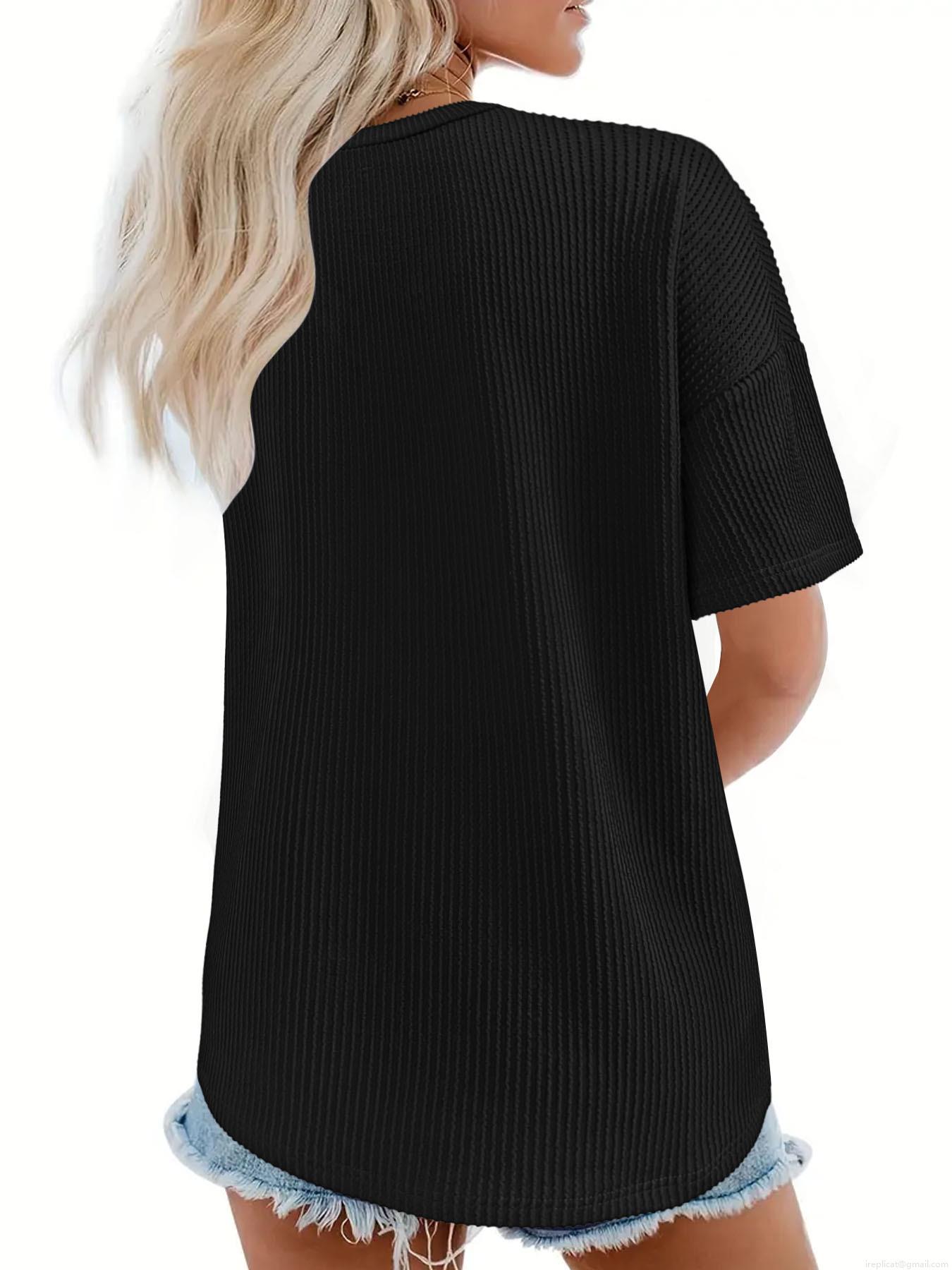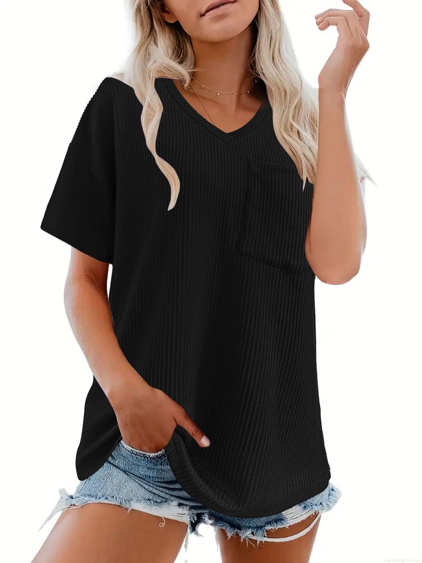 • Women's Casual V Neck Short Sleeve T-Shirt Loose Waffle Knit Top With Pocket Solid Color Polyester Spandex Blend Tee For Daily Wear
