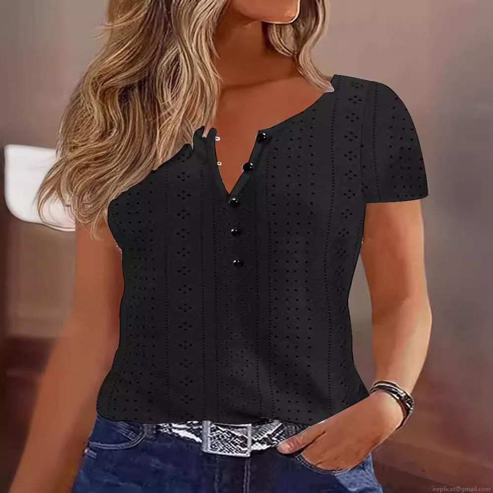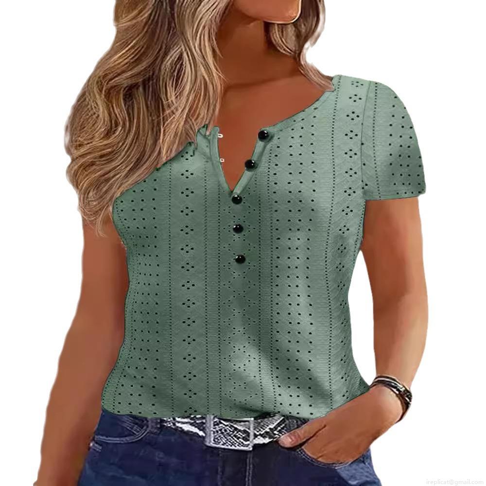 • Women's Casual V-Neck Button Down Hollow Out T-Shirt Summer Short Sleeve Jacquard Polyester Top Loose Fit Solid Color Fashion Blouse for Women