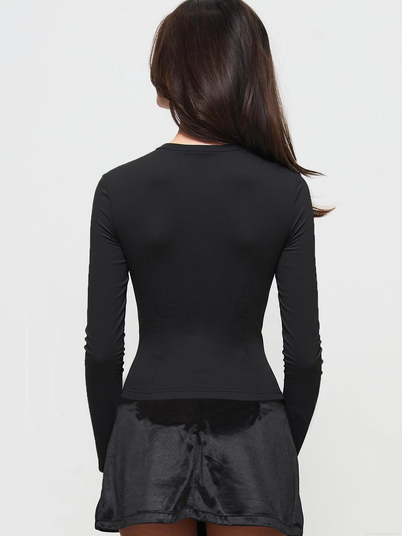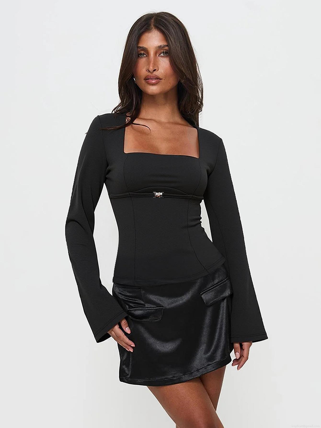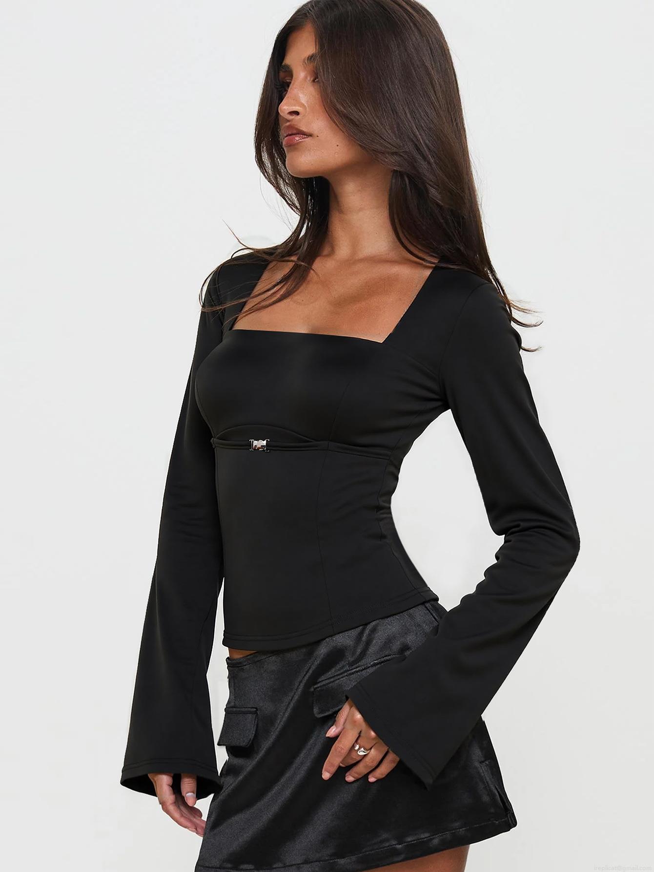• Women's Chic Square Neck Long Sleeve Top Elegant Metal Buckle Pleated Details Slim Fit Black Tee Flare Sleeve Polyester Elastane Knit Shirt For Women