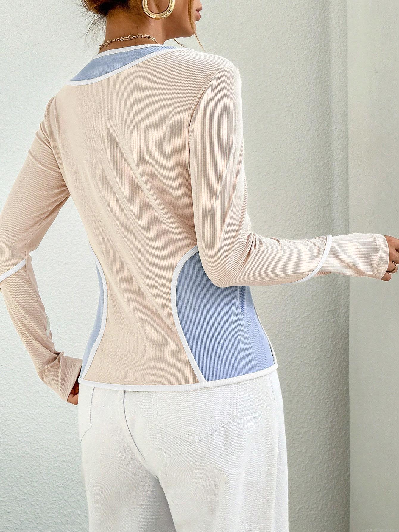 • Women's Color Block Knitted Top Elegant Long Sleeve Round Neck Slim Fit Ribbed Base Shirt Fake Two-Piece Chic Polyester Elastane Pullover For Women