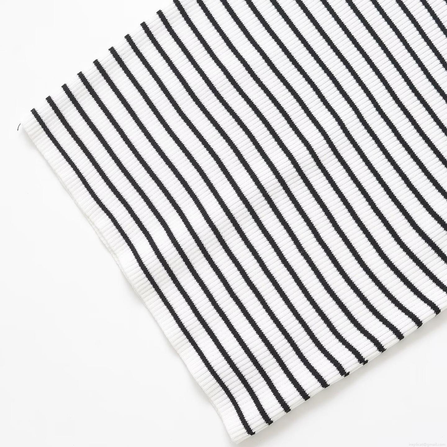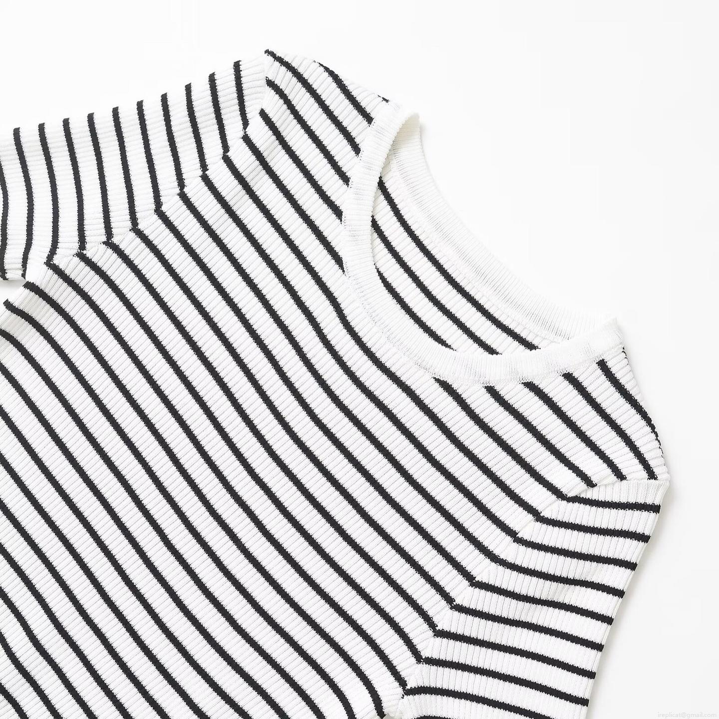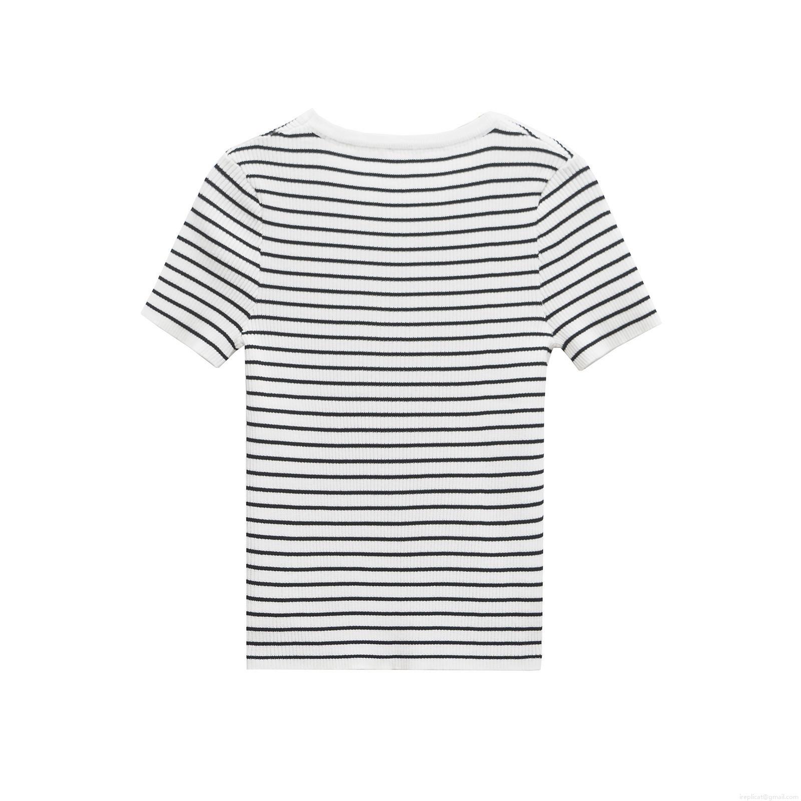 • Women's Contrast Striped Ribbed Knit T-Shirt Slim Fit Short Sleeve Crew Neck Mercerized Cotton Blend Casual Summer Top