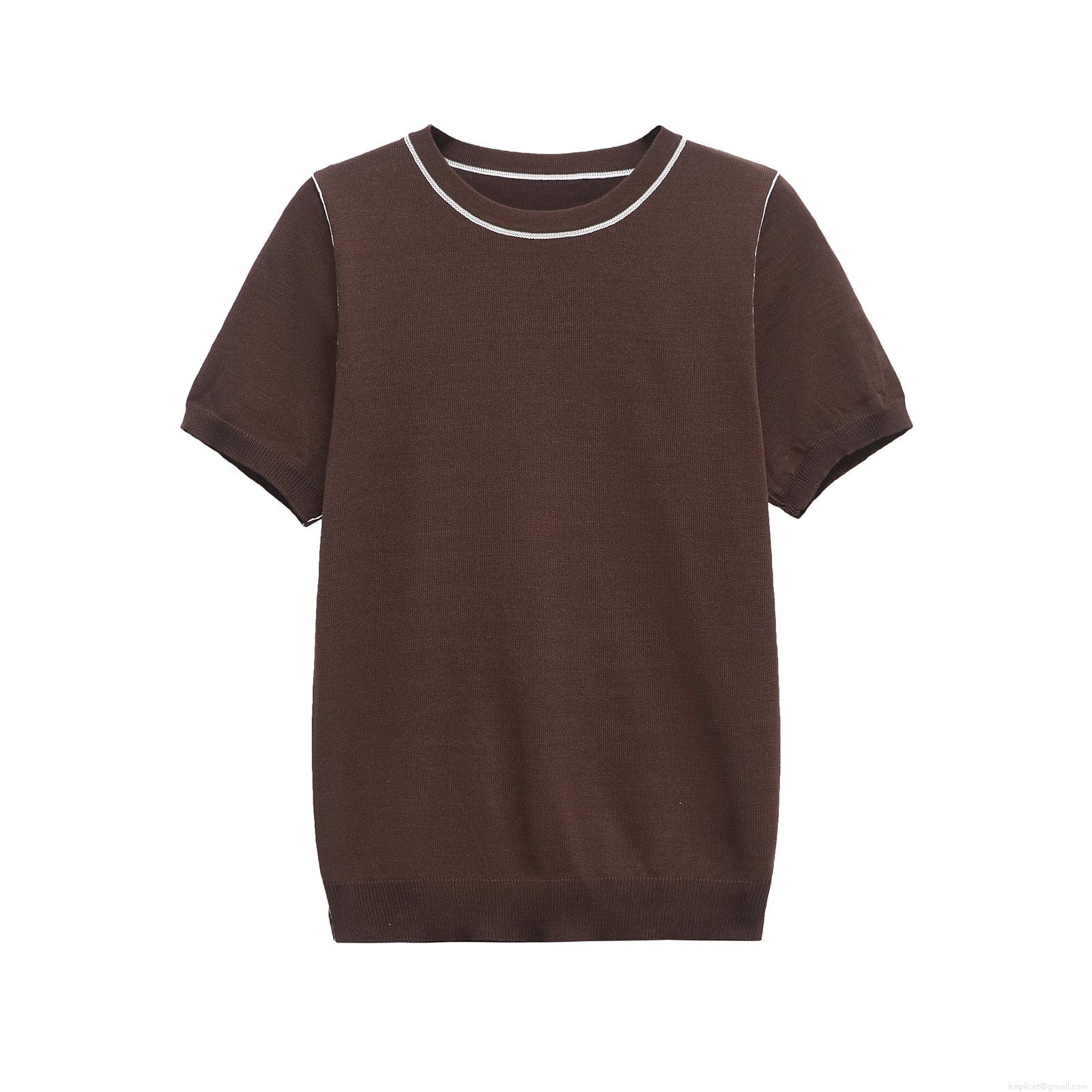 Women's Contrast Trim Knit T-Shirt Round Neck Short Sleeve Mercerized Polyester Top Summer European Streetwear Casual Basic Tee For Women