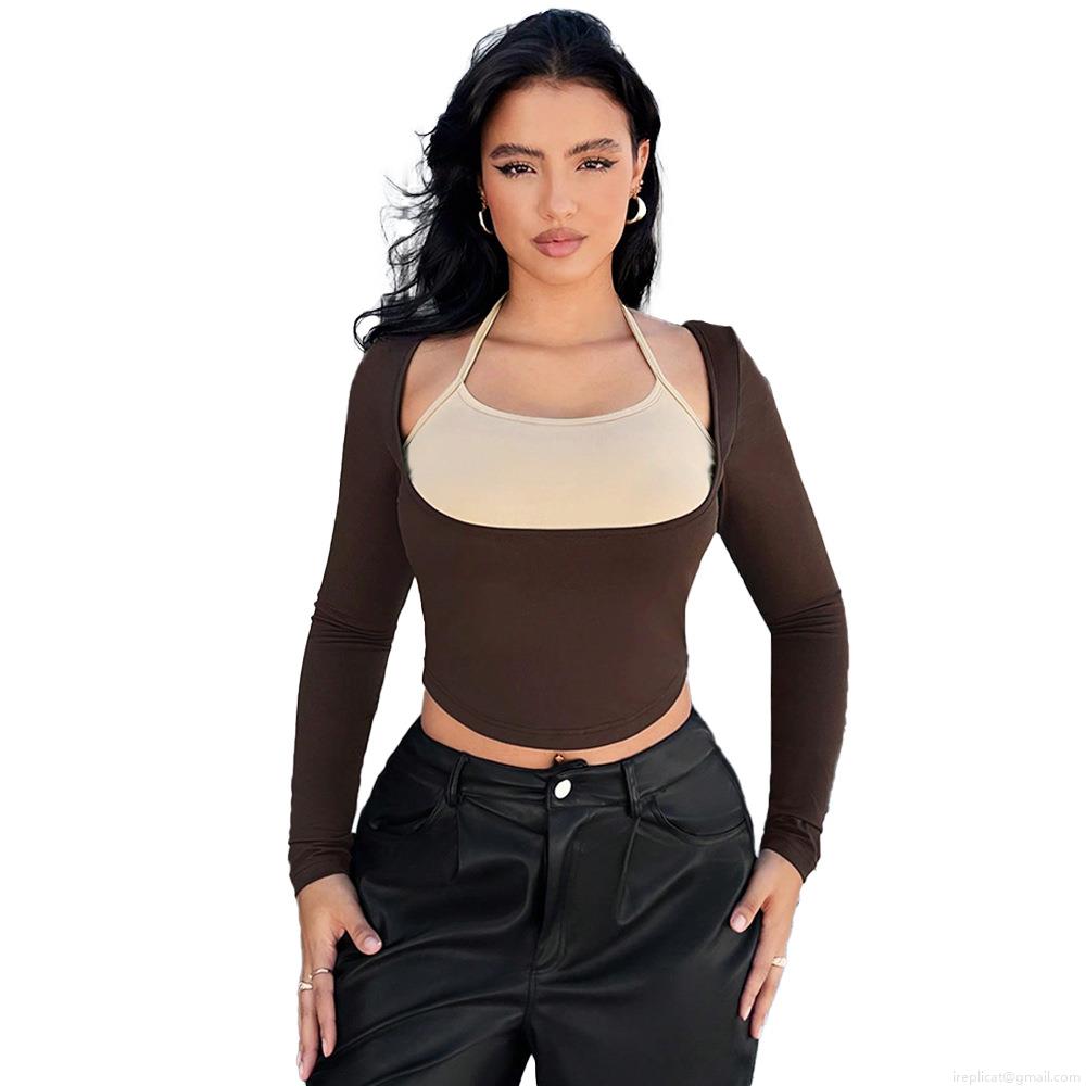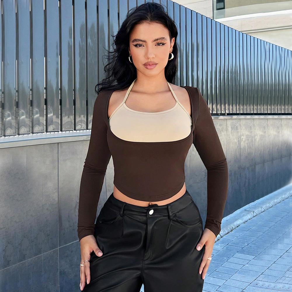 Women's Cropped Long Sleeve T-Shirt Viscose Elastane Two-Piece Halter Neck Slim Fit Top Contrast Color Streetwear Sexy Style For Summer Autumn