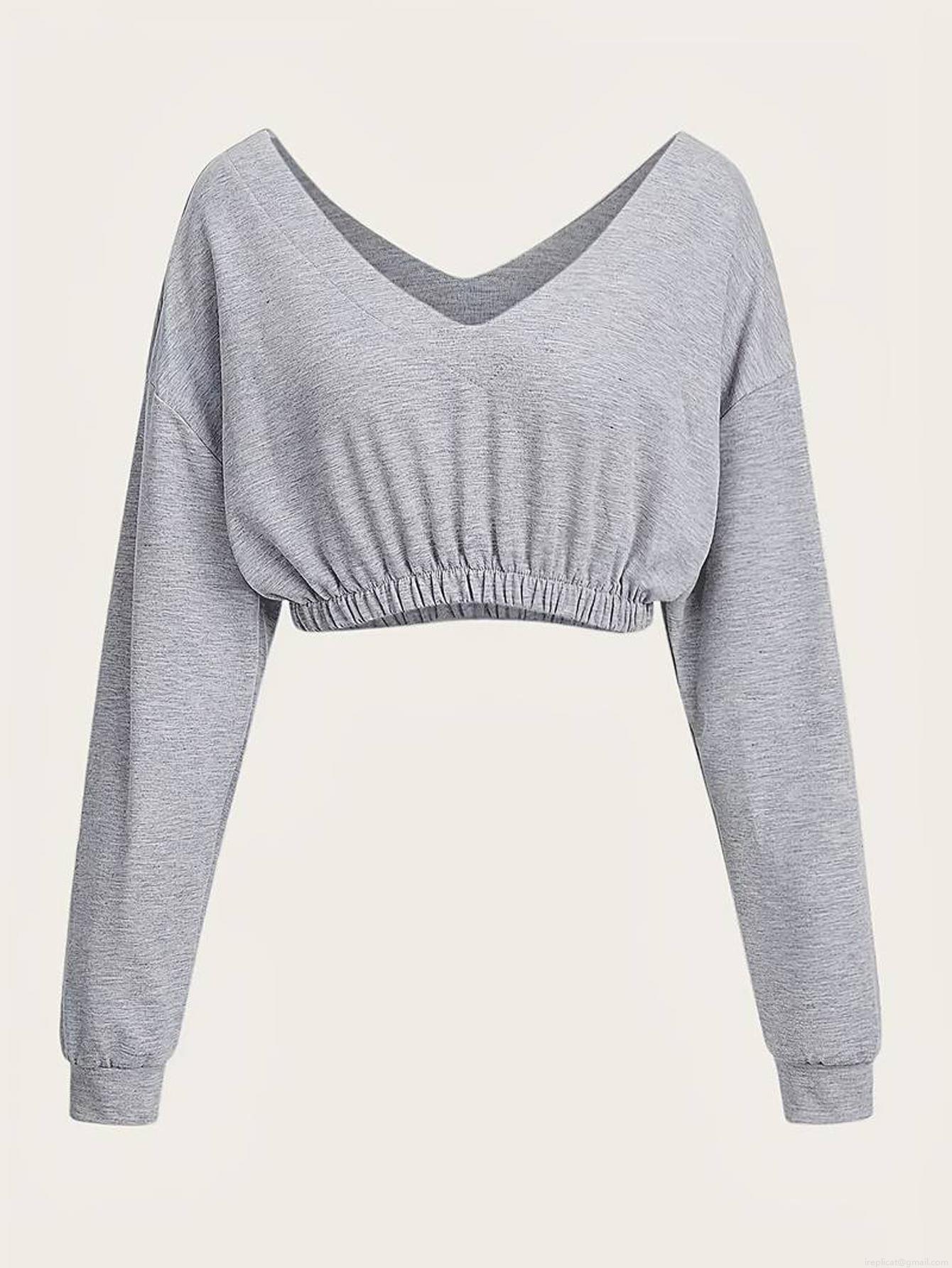 • Women's Cropped V-Neck Long Sleeve T-Shirt Cotton Blend Sexy Slim Fit Casual Pullover Sweatshirt For Daily Sports Fashion Gray Top
