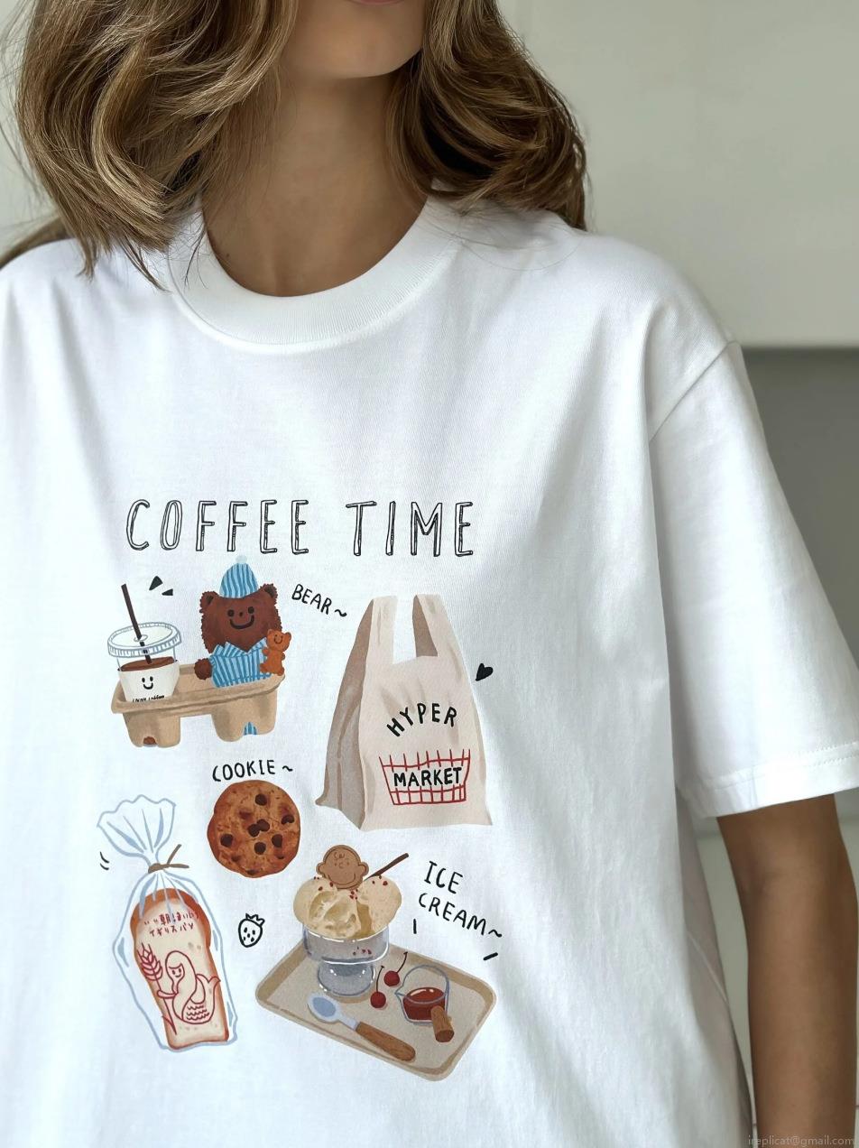 • Women's Cute Cartoon Bear Coffee Graphic Print Cotton Blend T-Shirt Round Neck Short Sleeve Loose Fit Casual Summer Streetwear Tee Top White