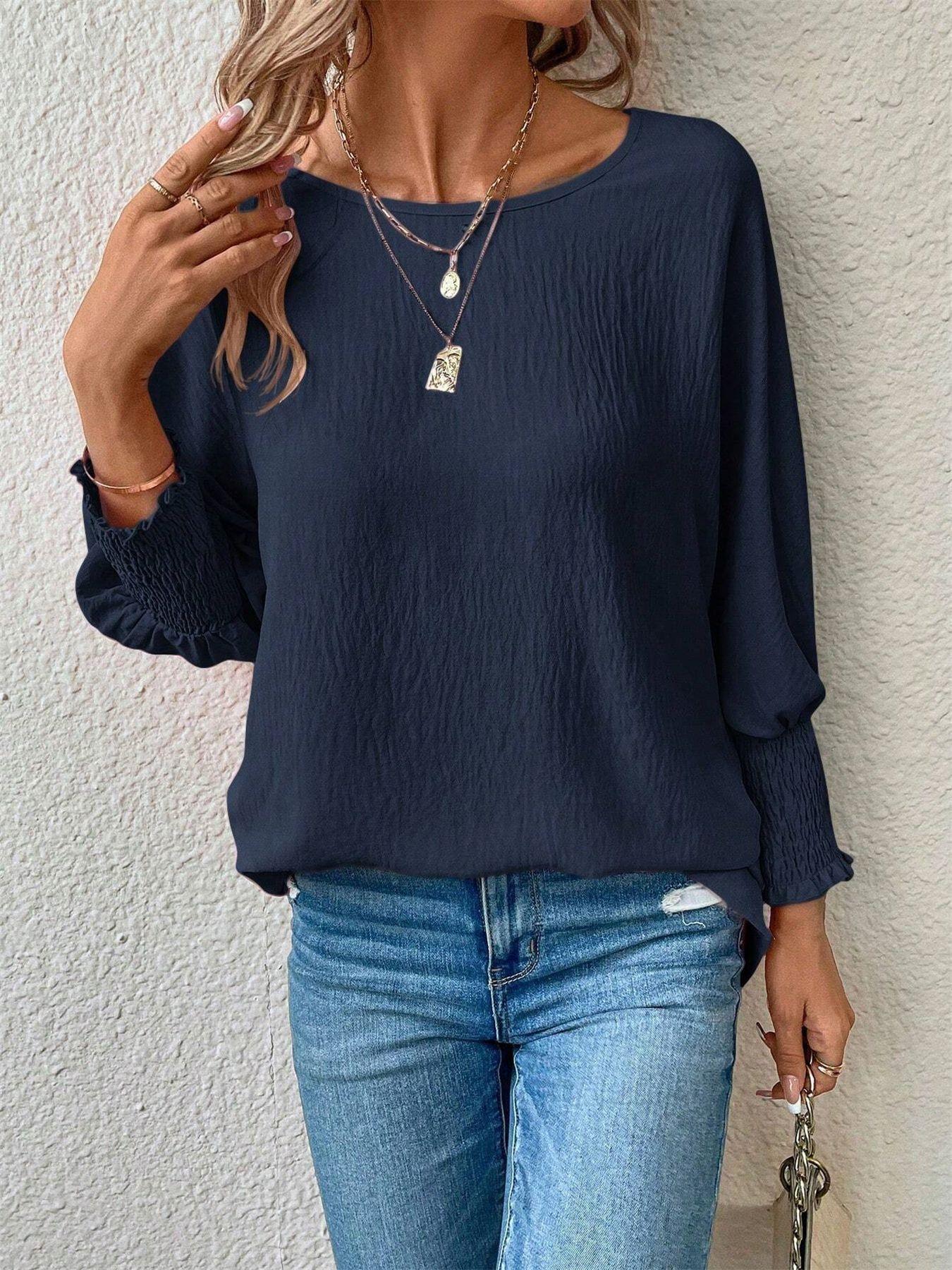 • Women's Elegant Crinkled Texture Long Sleeve T-Shirt Round Neck Loose Blouse With Smocked Cuffs Casual Solid Color Navy Blue Top For Spring Summer Fashion