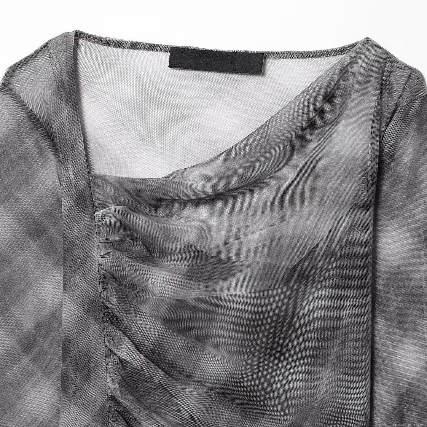 Women's Elegant Long Sleeve Plaid Mesh T-Shirt Asymmetric Slanted Neck Ruched Slim Fit Grey Casual Sexy See Through Tee Top For Ladies Dating