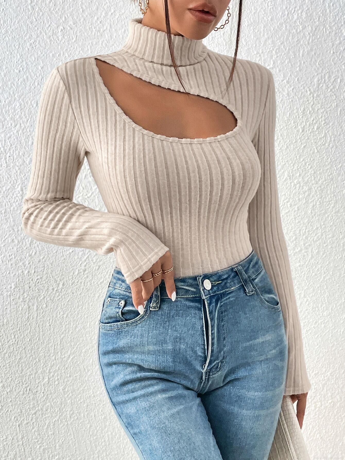 • Women's Elegant Mock Neck Cutout Ribbed Long Sleeve T-Shirt Slim Fit Short Top Solid Color Polyester Spandex Knitted Tee for Daily Casual Wear