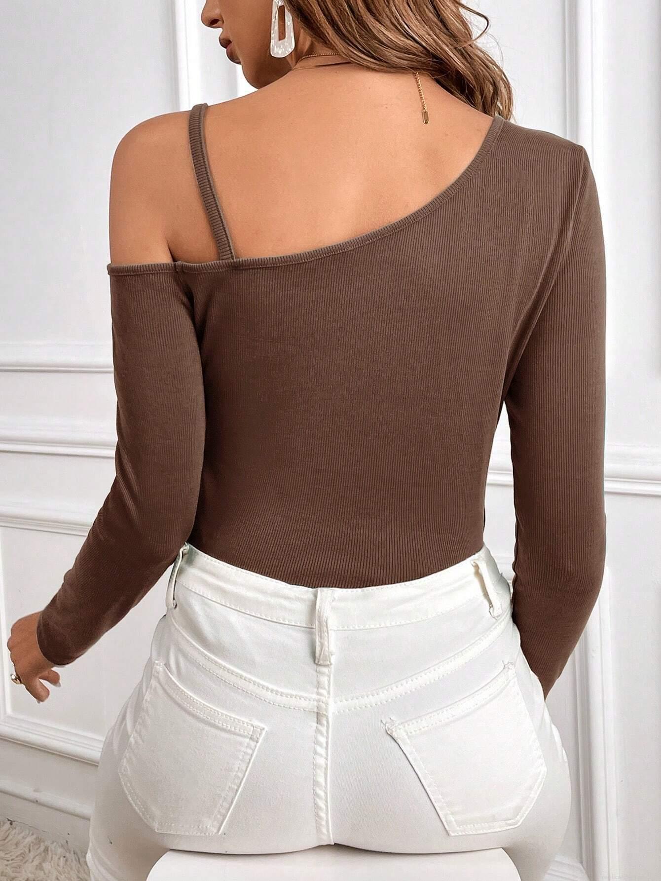 • Women's Elegant Off-Shoulder T-Shirt Ribbed Knit Long Sleeve Top With Metal Chain Strap Slim Fit Commuter Polyester Blouse Autumn Winter Shirt