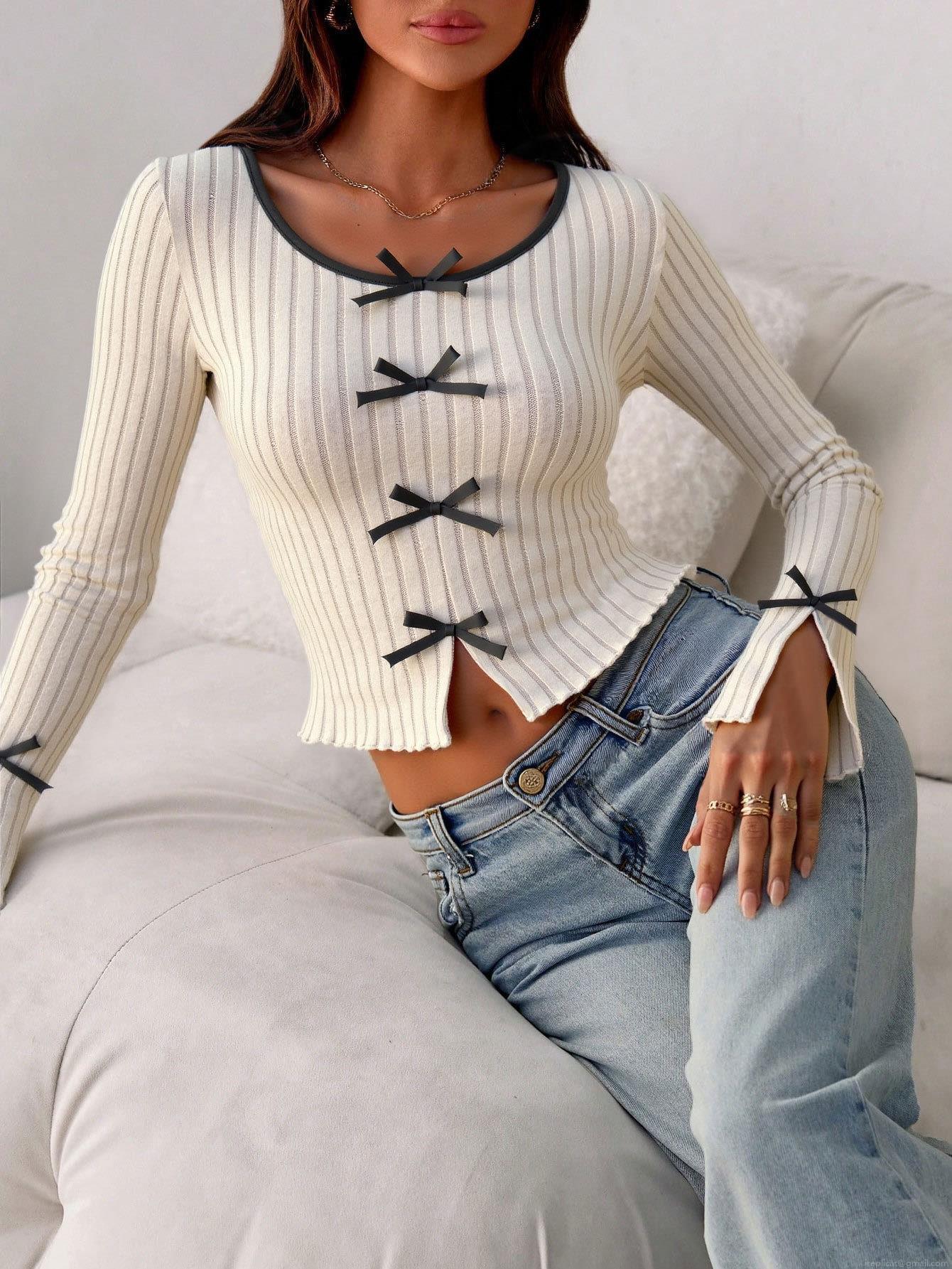 • Women's Elegant Ribbed Knit Long Sleeve T-Shirt Slim Fit Base Layer Top With Black Bow Decoration Contrast Piping Pullover For Ladies