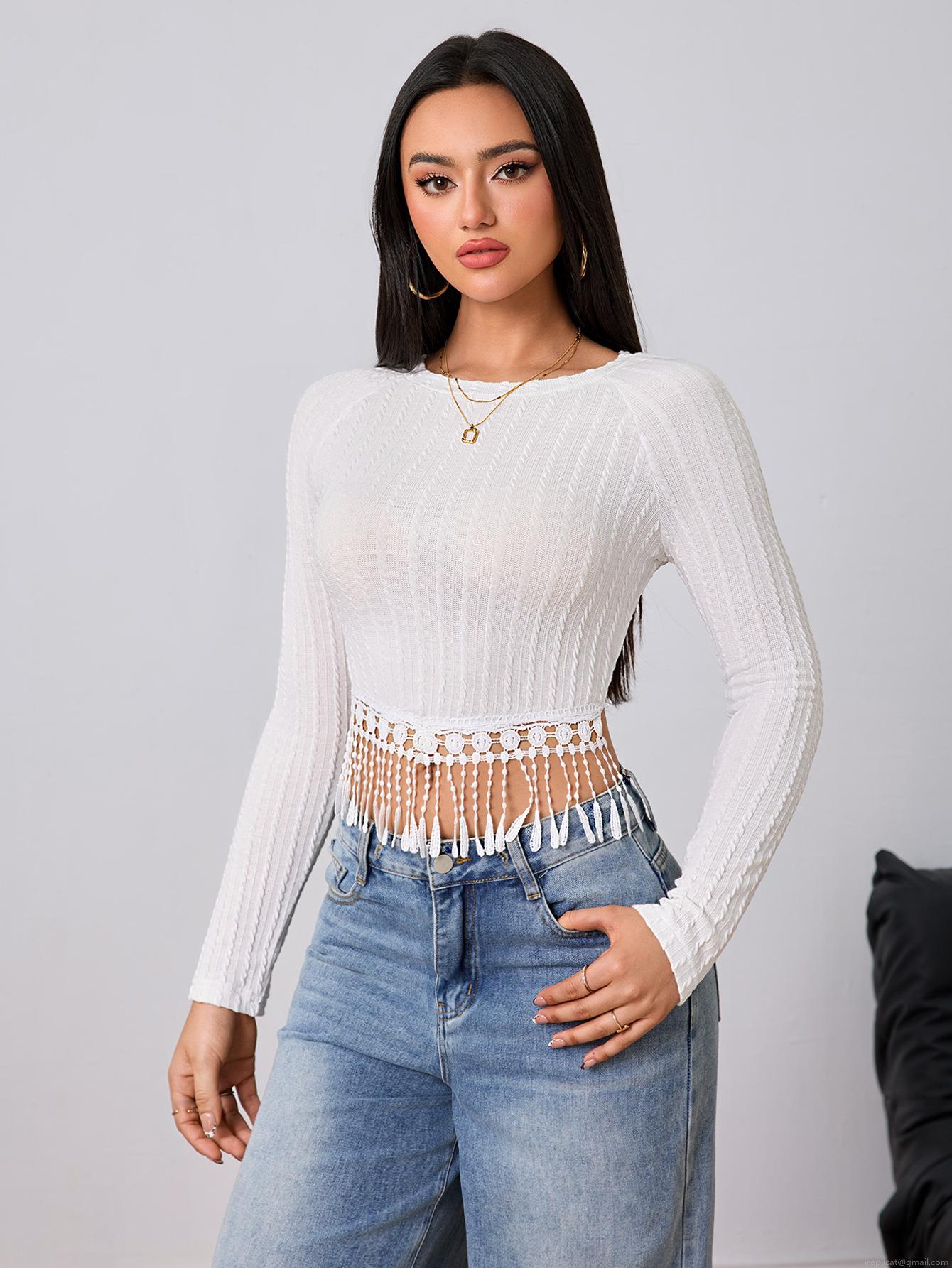 • Women's Elegant Ribbed Knit T-Shirt Slim Fit Round Neck Long Sleeve Top With Crochet Fringe Hem Cotton Polyester Blend Bohemian Casual Blouse