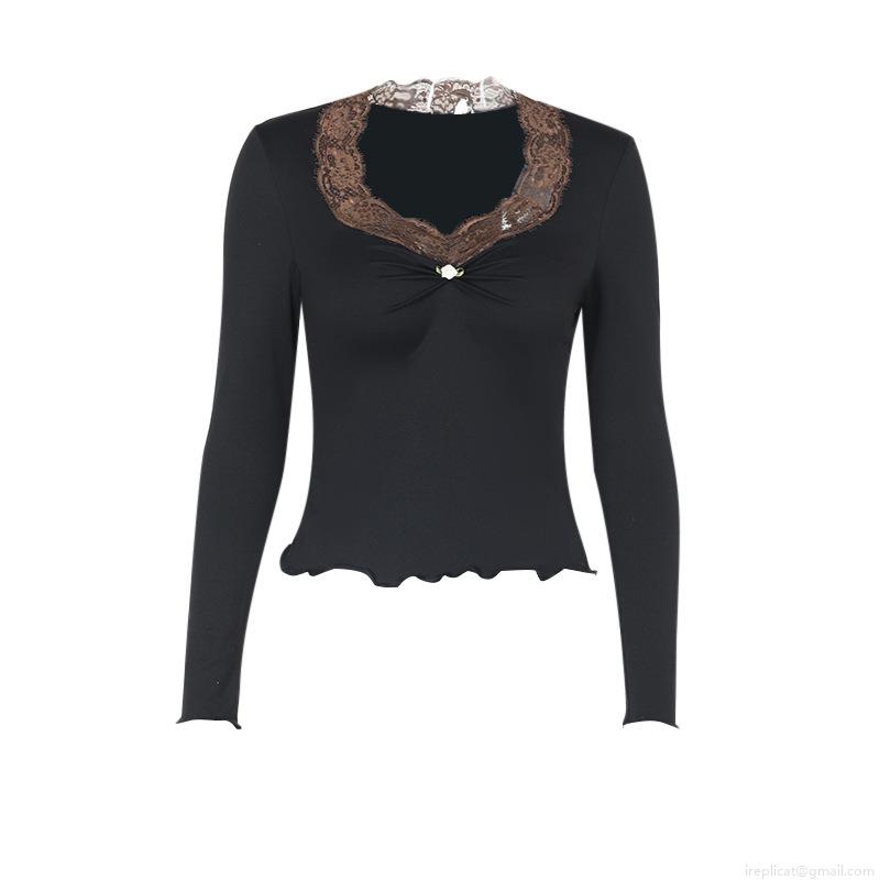 • Women's Elegant Slim Fit V-Neck Long Sleeve T-Shirt with Lace Trim and 3D Flower Decor French Vintage Polyester Spandex Ruffle Hem Top