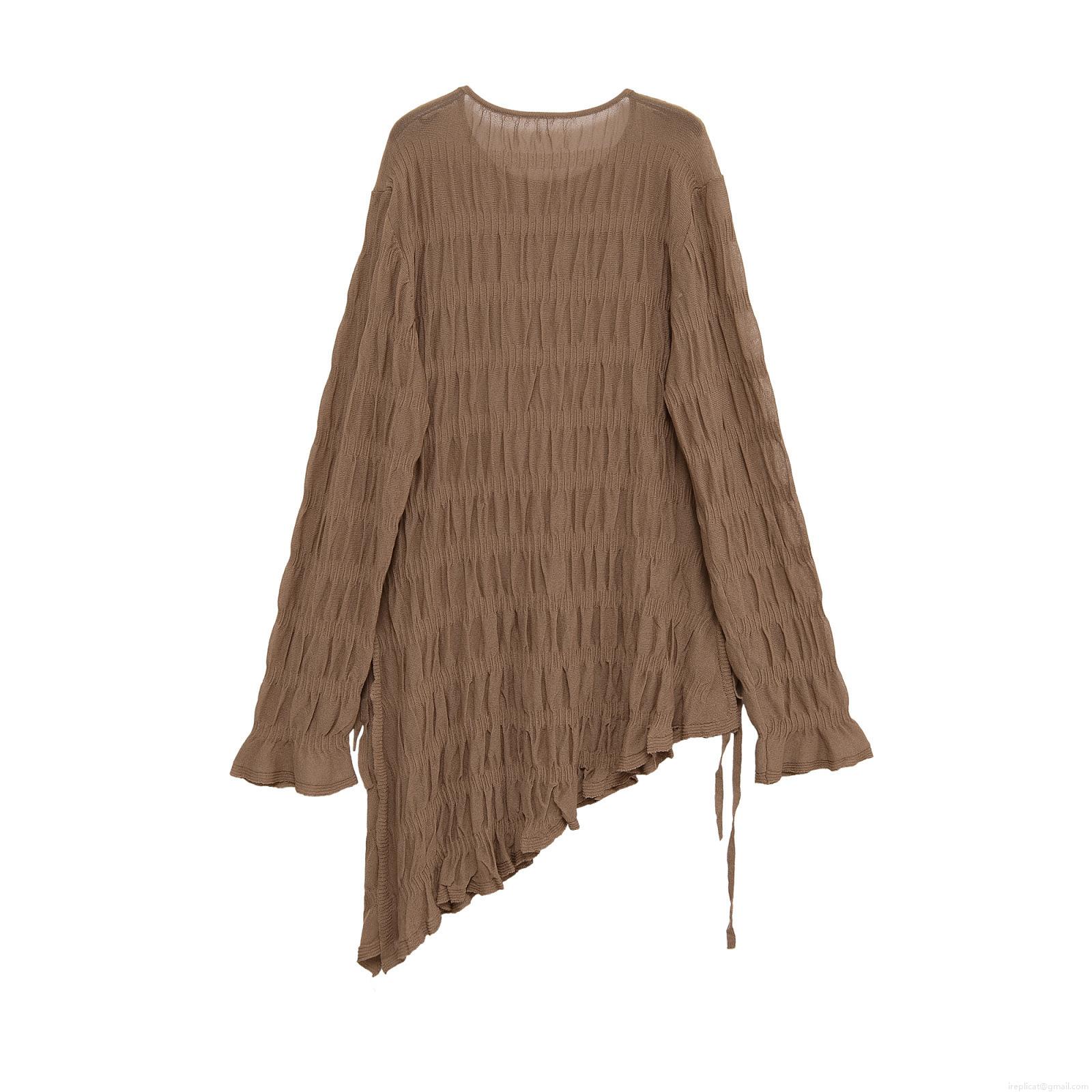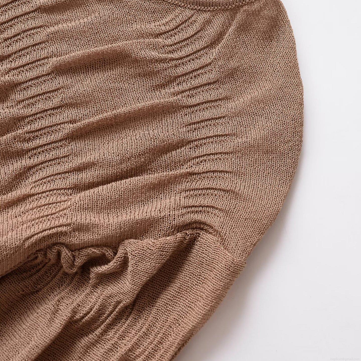 • Women's Elegant Solid Brown Pleated Mini Dress Long Sleeve Round Neck Asymmetric Hem Side Drawstring Ruched T-Shirt Top For Casual Vacation Party