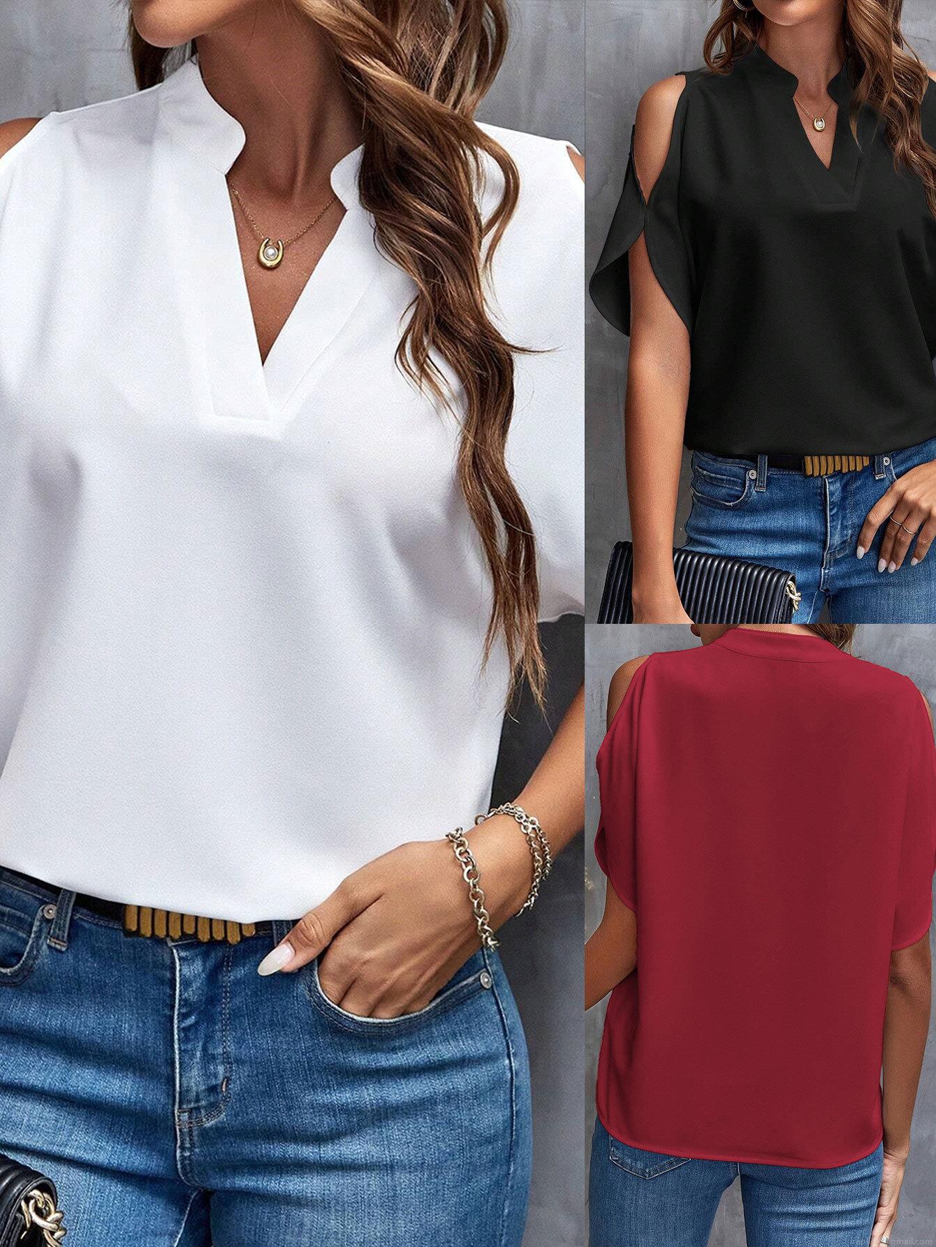 • Women's Elegant V Neck Cold Shoulder T-Shirt Solid Color Short Sleeve Chiffon Blouse For Commute Summer Casual Tops