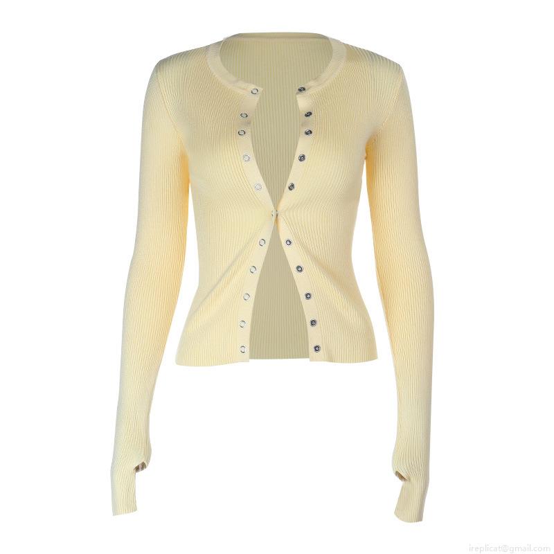 • Women's Elegant V-Neck Ribbed Knit T-Shirt Slim Fit Long Sleeve Cardigan Top With Metal Buttons And Thumb Holes Casual Pale Yellow Polyester Top