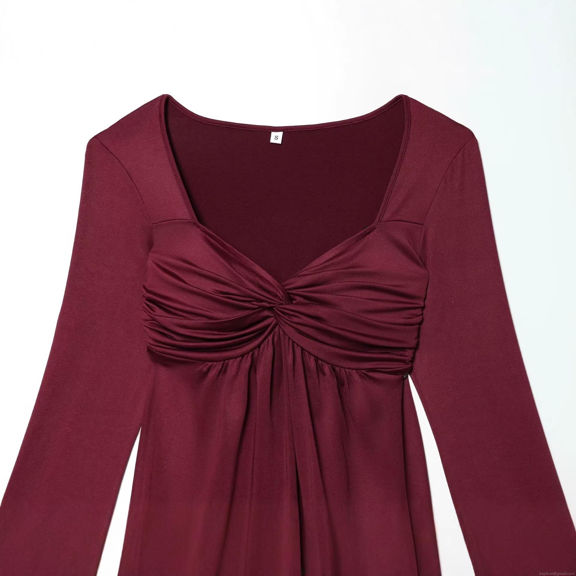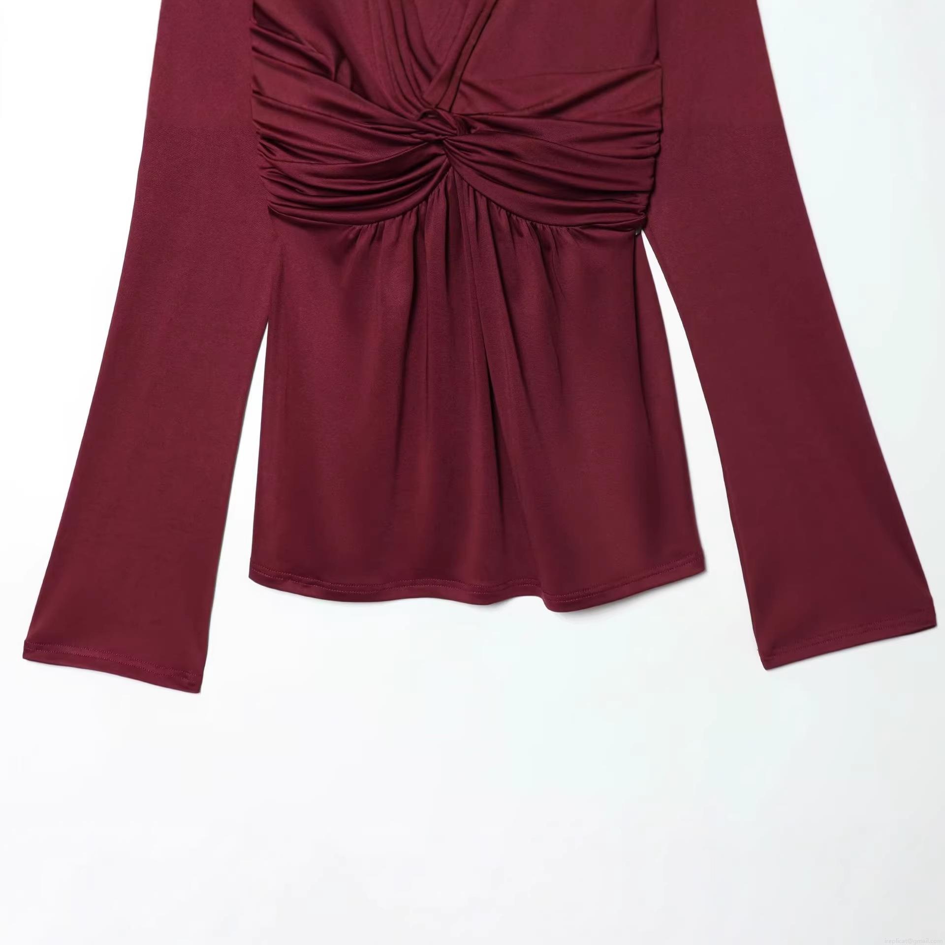 • Women's Elegant V-Neck Twist Knot T-Shirt Ruched Front Flare Long Sleeve Blouse Slim Fit Solid Color Polyester Spandex Top For Party Date Casual