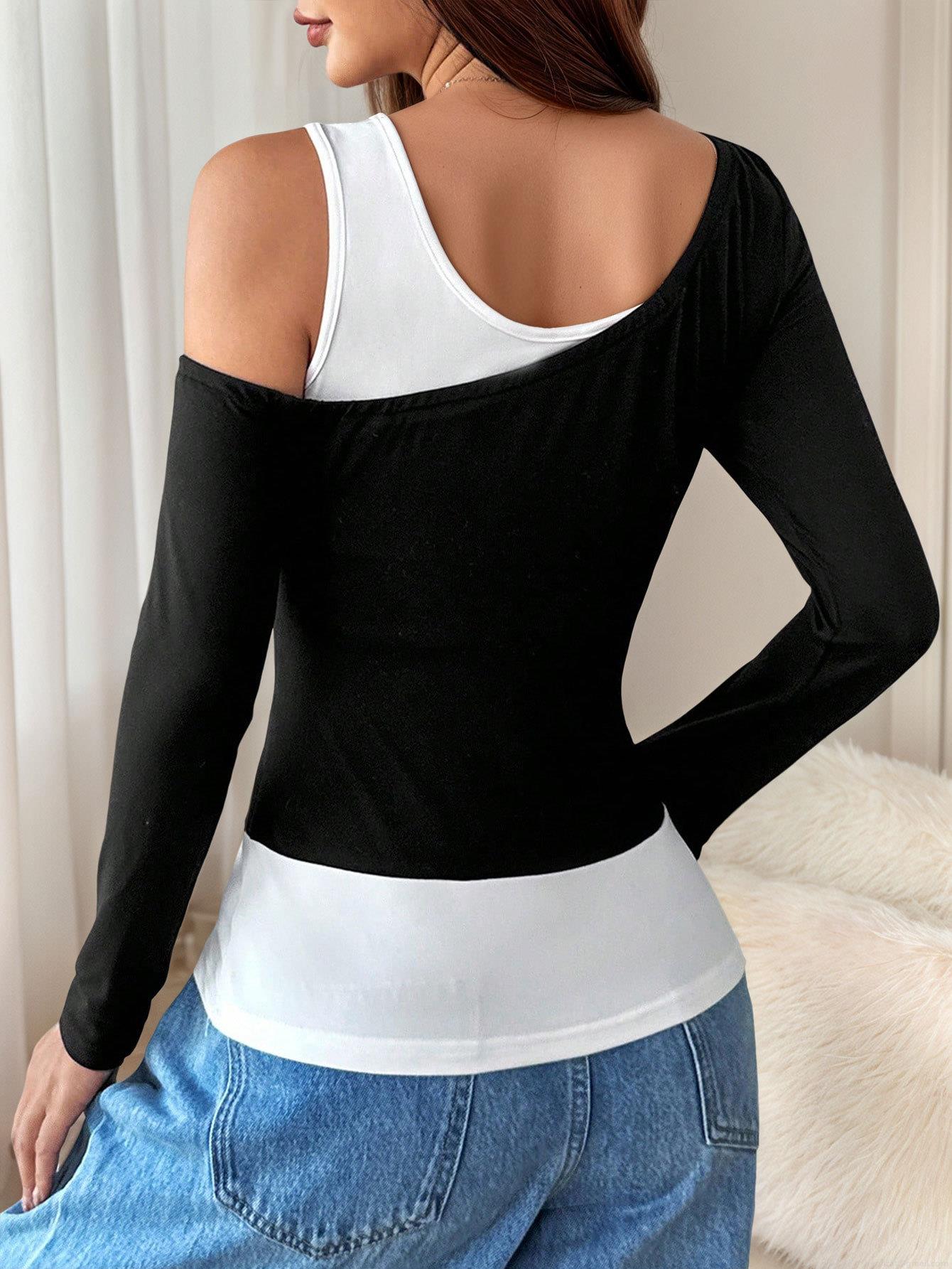 • Women's Fashion Asymmetrical One Shoulder Color Block T-Shirt Patchwork Black and White Long Sleeve Slim Fit Casual Chic Top