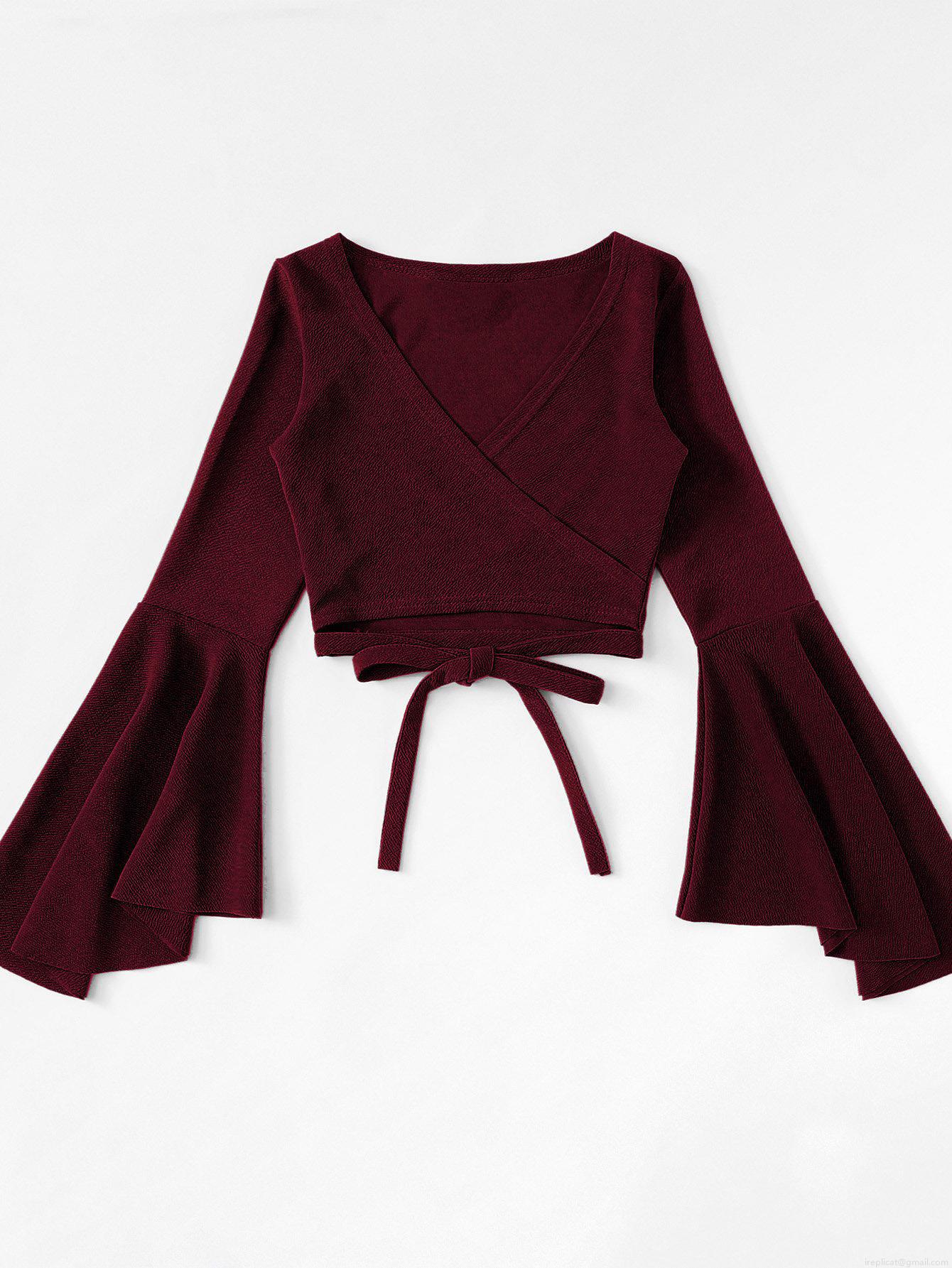 • Women's Fashion Cropped T-Shirt Polyester Elastane Bell Sleeves V Neck Criss-cross Tie Back Top Sexy Streetwear Solid Burgundy Long Sleeve Shirt