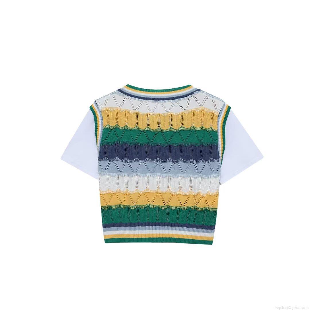 Women's Fashion Faux Two Piece Knit T-Shirt Hollow Out Crochet Patchwork Short Sleeve Top Striped Color Block Round Neck Casual Streetwear Tee