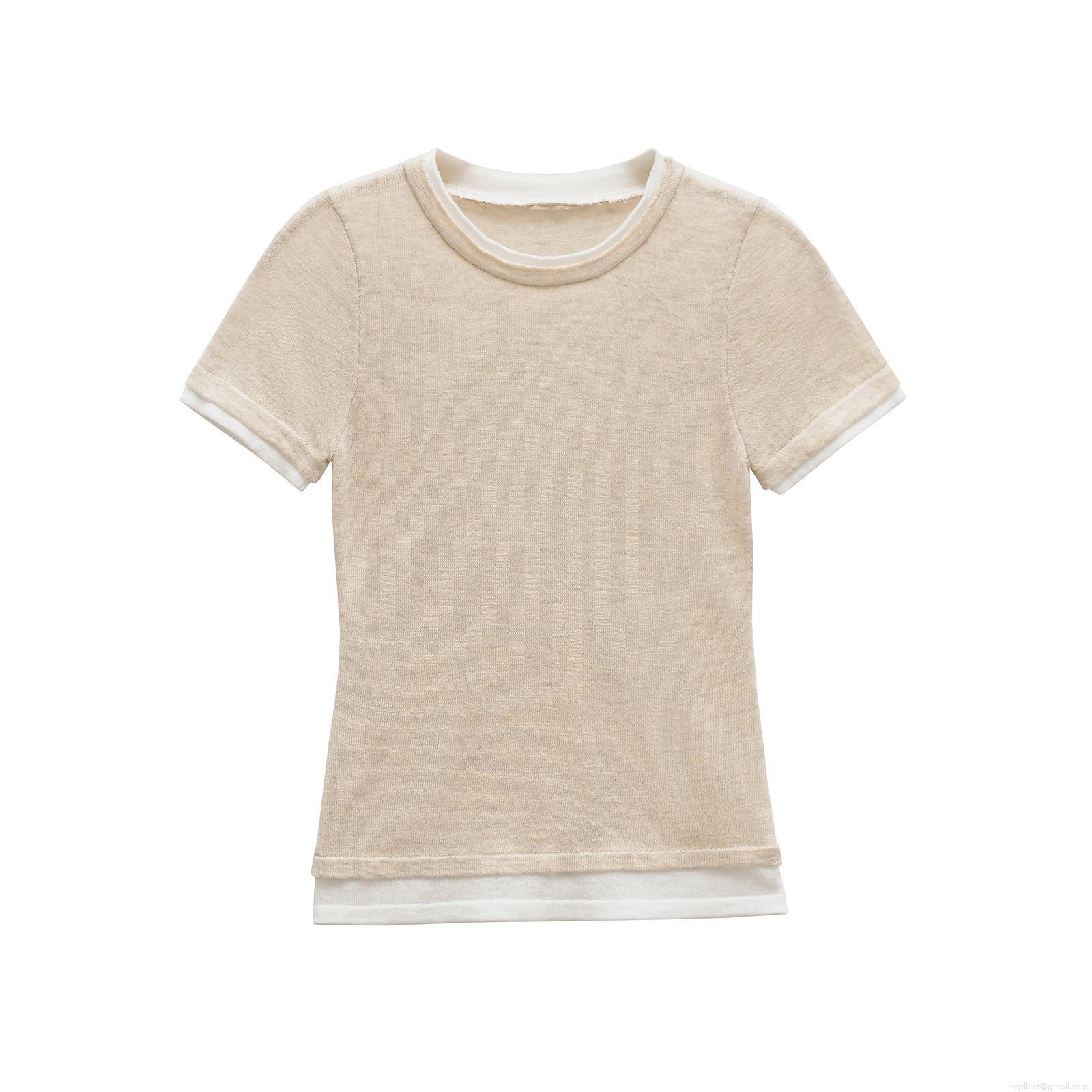 • Women's Fashion Knitted Fake Two-Piece Short Sleeve T-Shirt Slim Fit Contrast Trim Round Neck Casual Summer Top