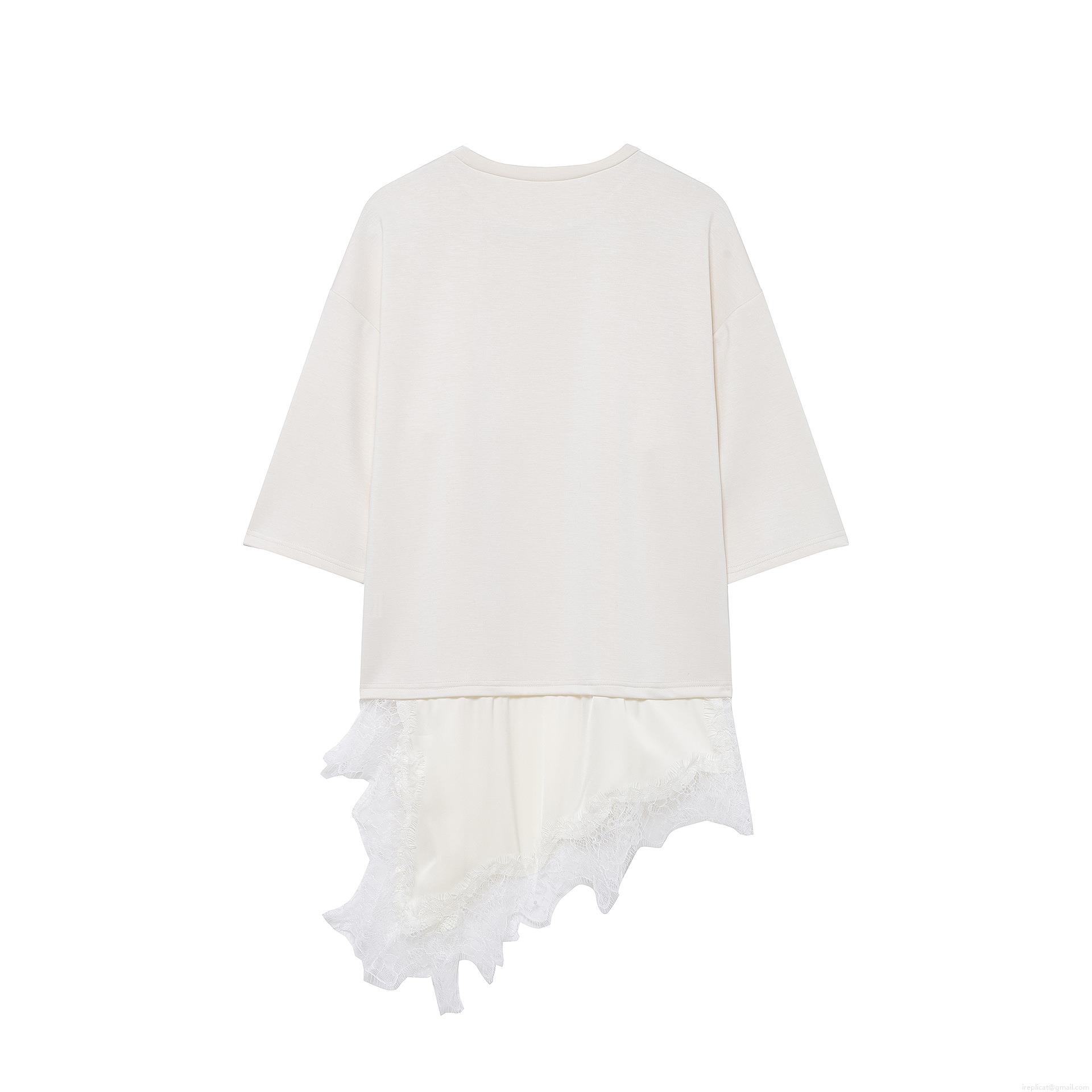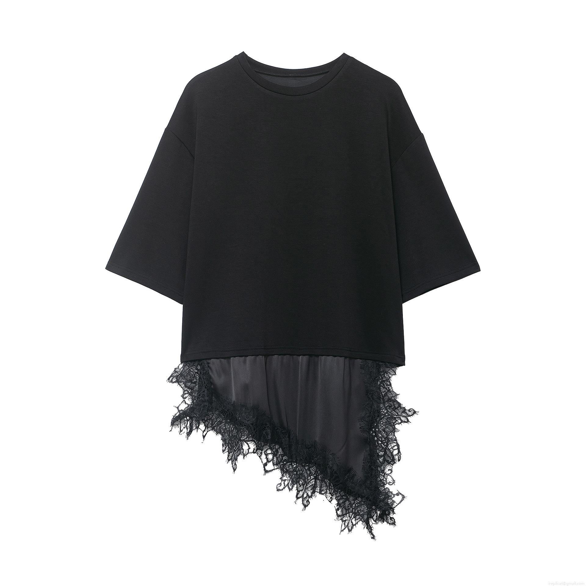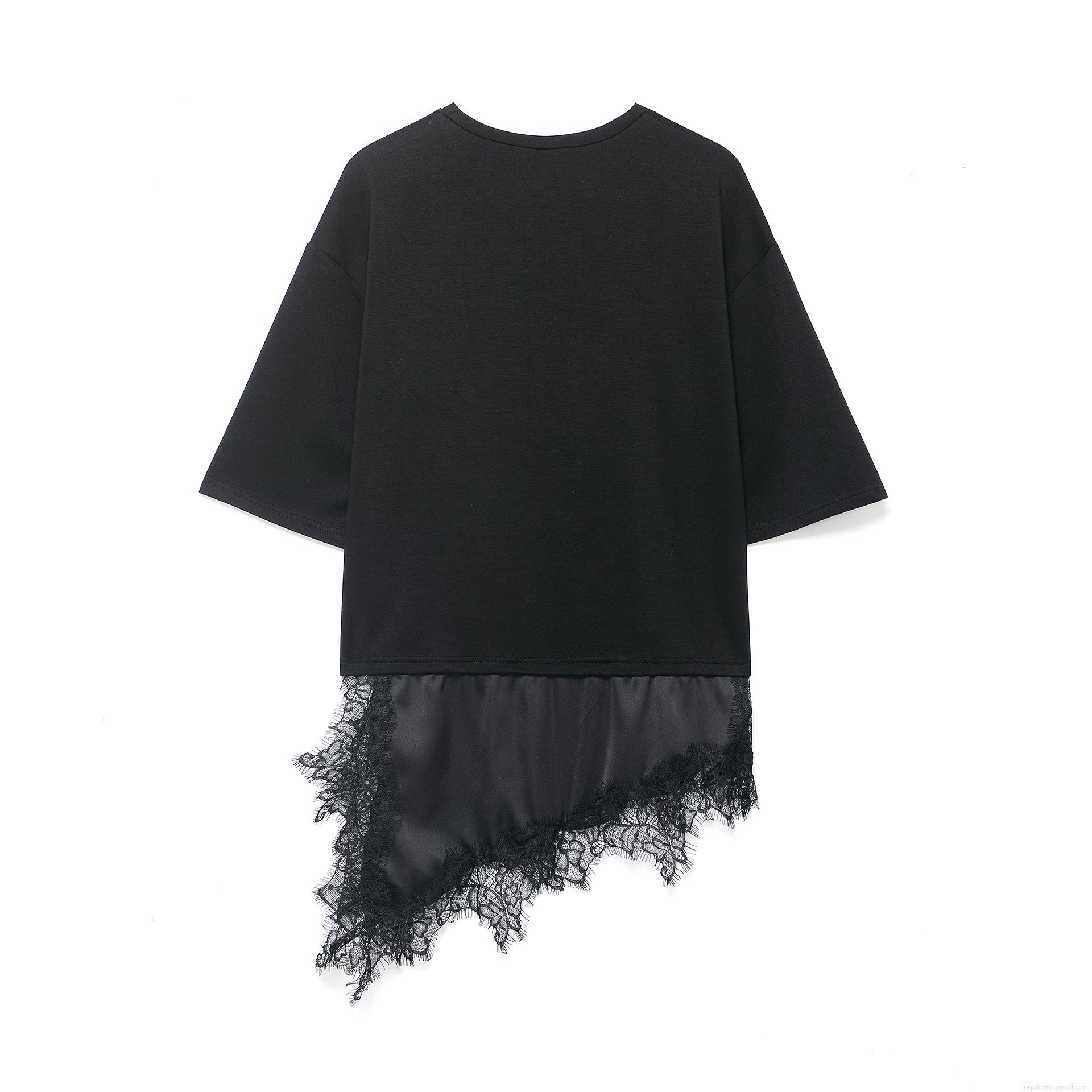 • Women's Fashion Lace Satin Splicing T-Shirt Round Neck Short Sleeve Top With Asymmetric Hem Patchwork Casual Western Style Solid Color Pullover For Women Daily Wear Breathable Knit Fabric Clothing