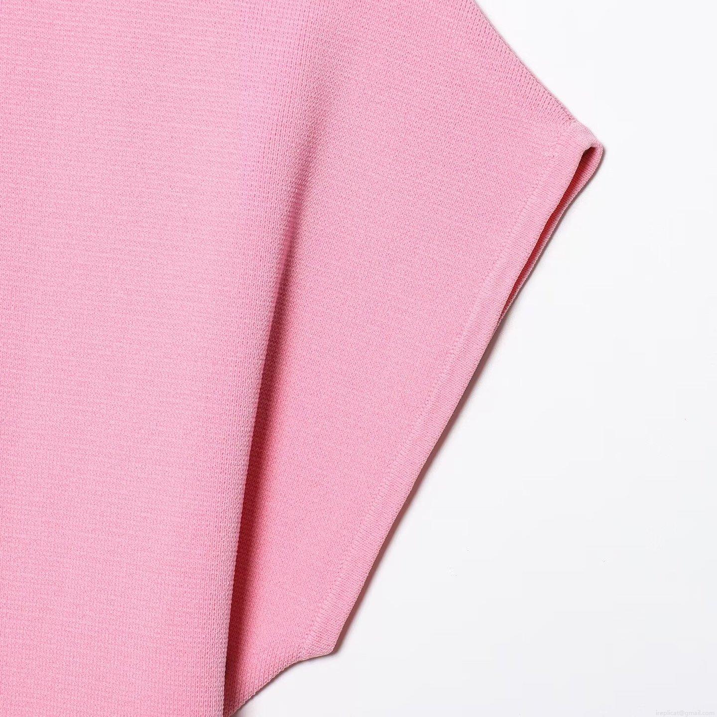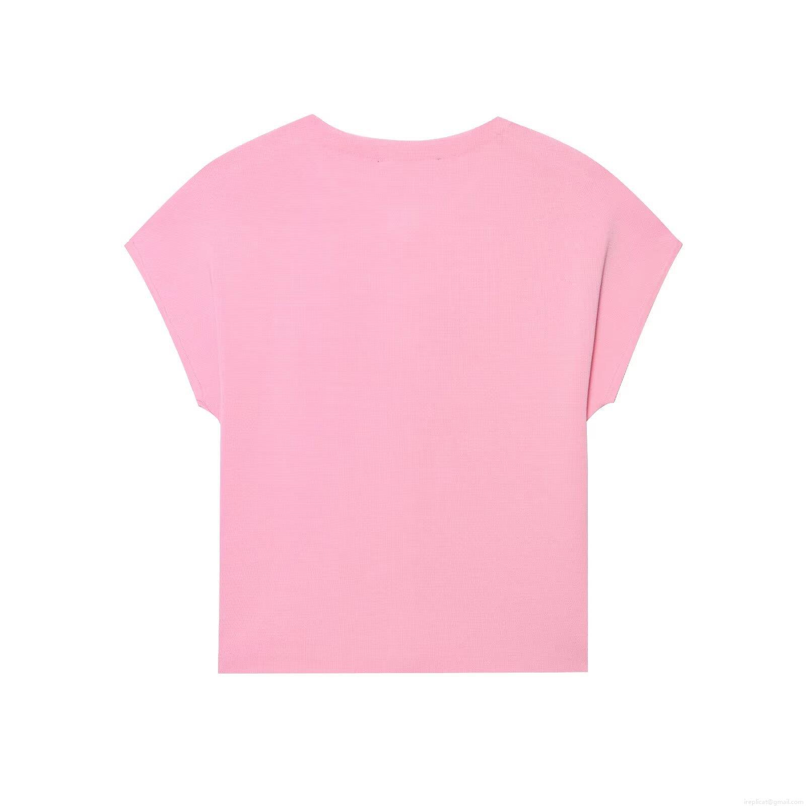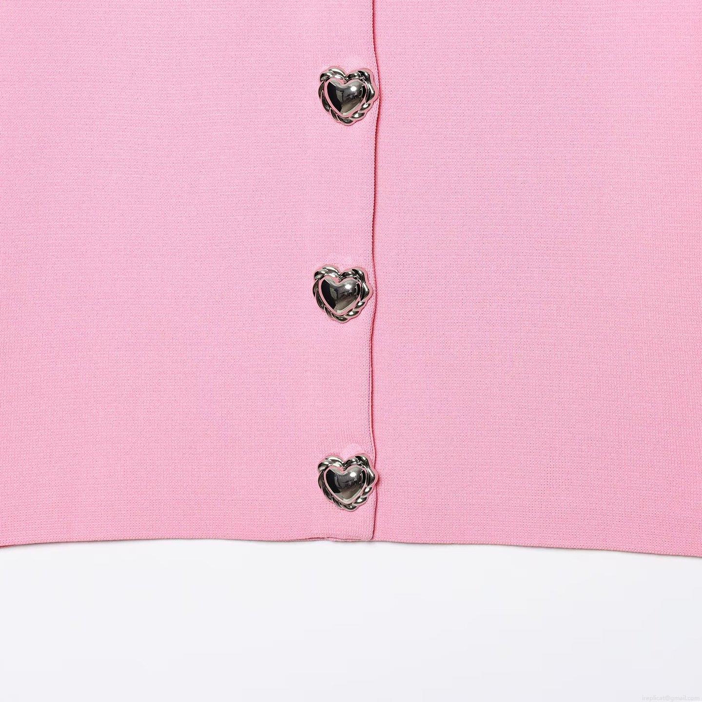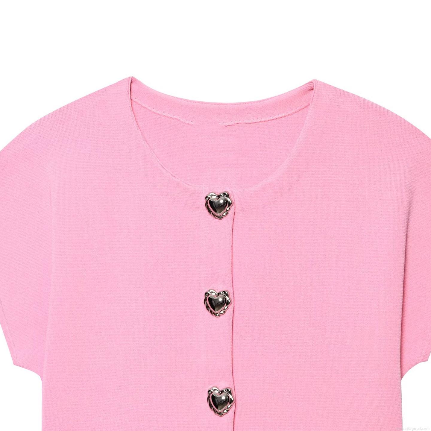 Women's Fashion Pink Knit Short Sleeve Top Sweet Round Neck T-Shirt With Silver Heart Buttons Elegant Knitted Cardigan Casual Short Top