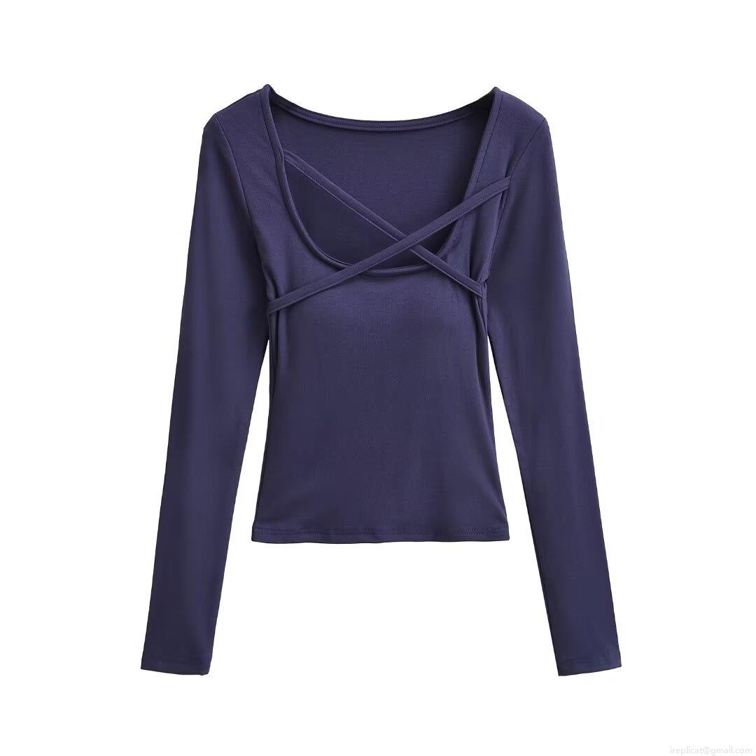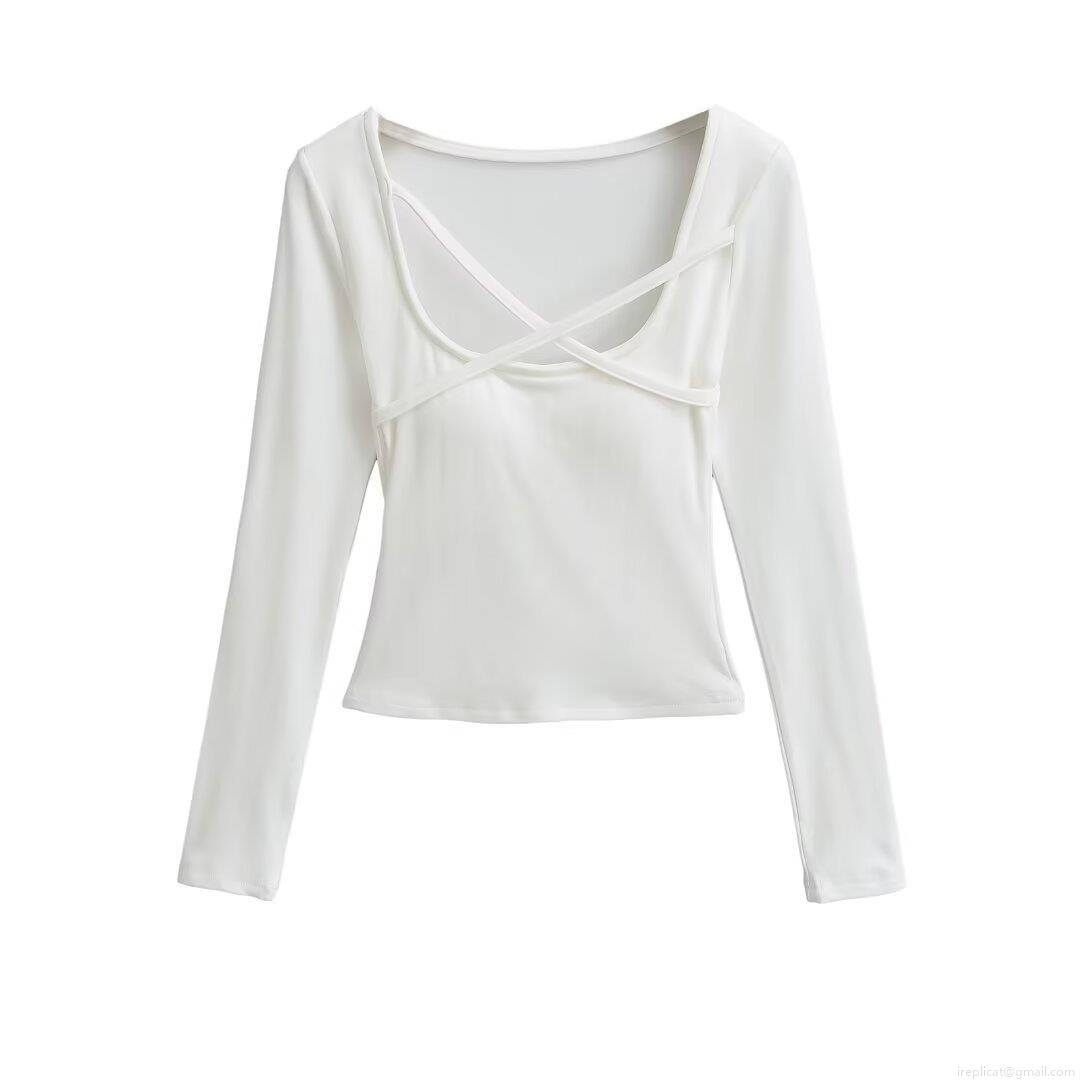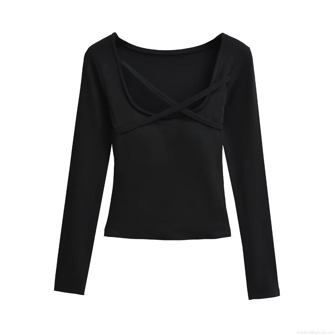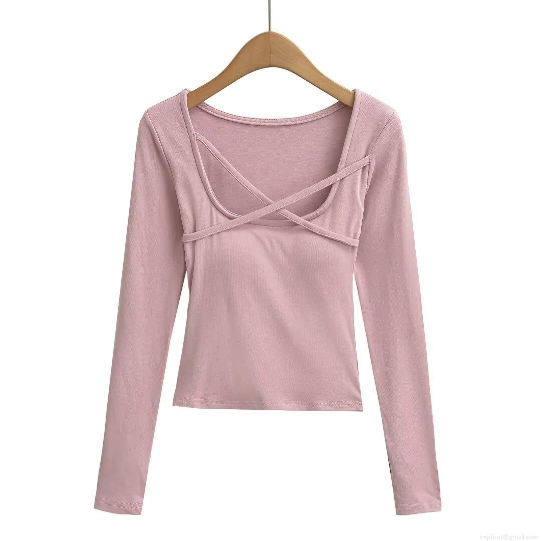Women's Fashion Square Neck Cross Strap Padded Slim Fit T-Shirt Long Sleeve Polyester Solid Color Crop Top Streetwear Sexy Autumn Winter Clothing