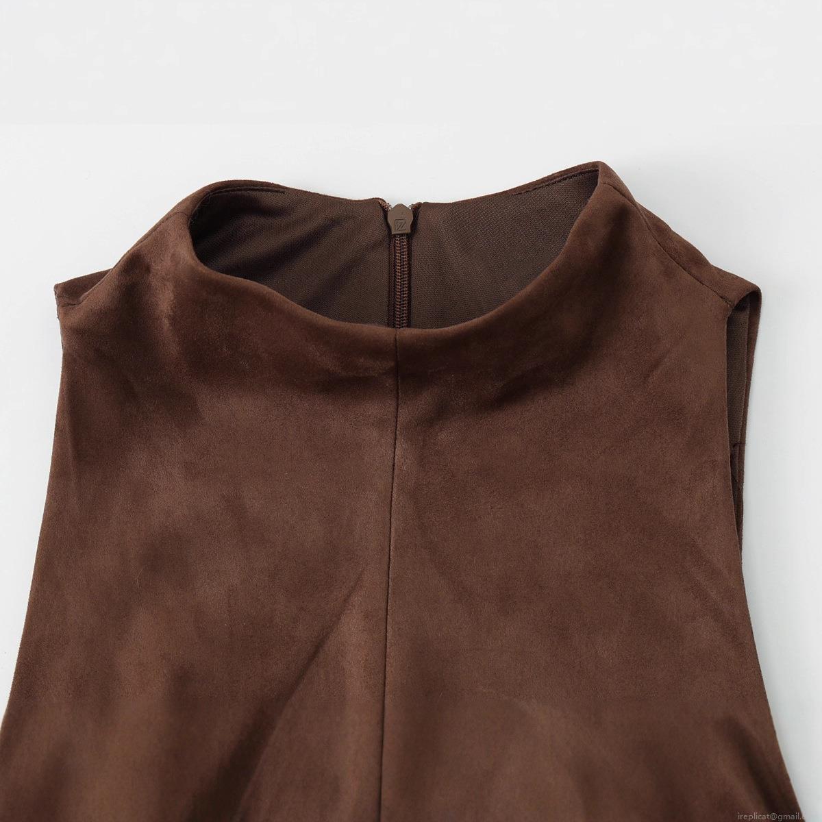 • Women's Faux Suede Sleeveless Top Round Neck Skirt Style Hem Street Fashion Casual Tank Top With Back Zipper Polyester Dark Brown Solid Color Clubwear
