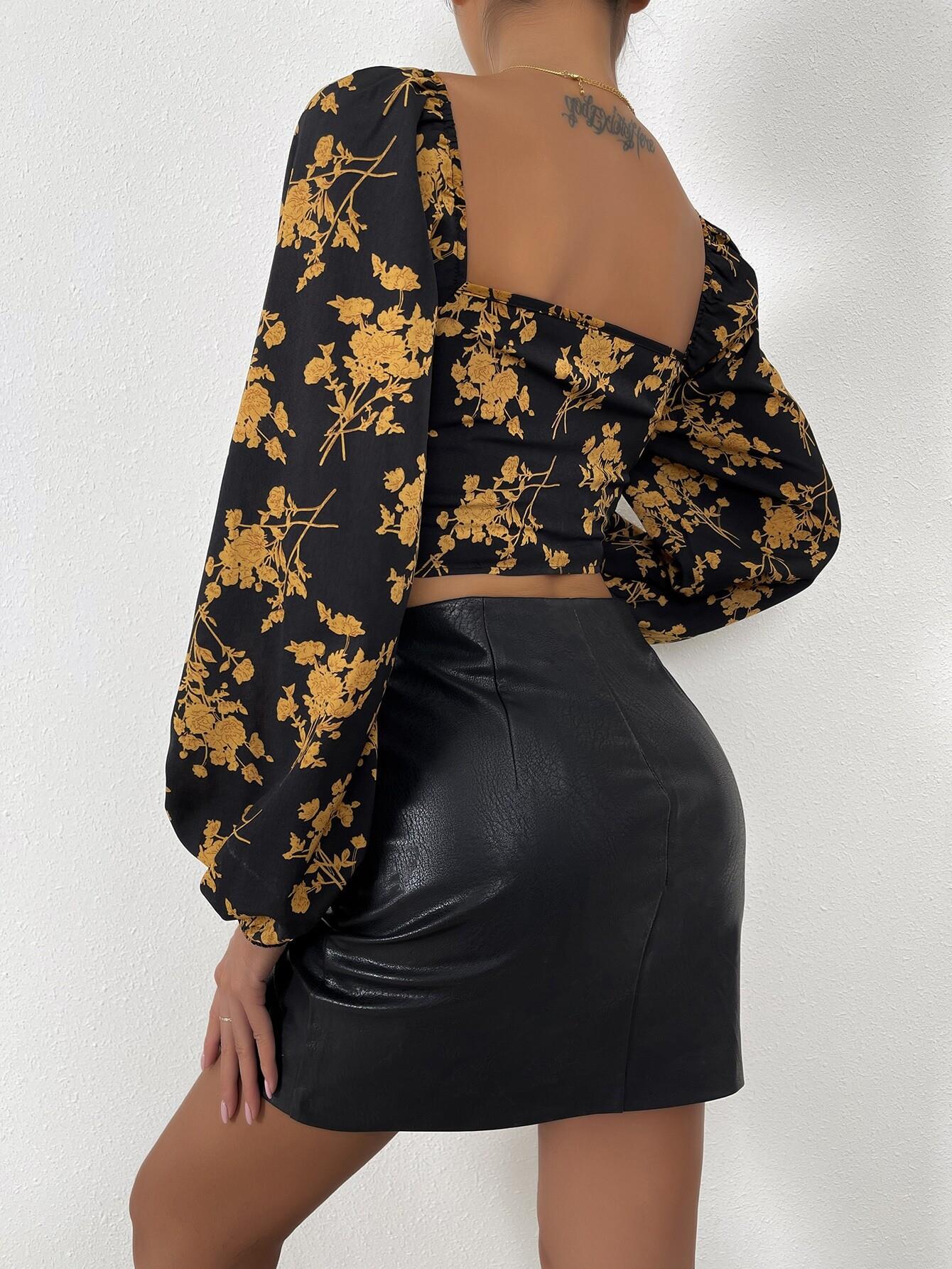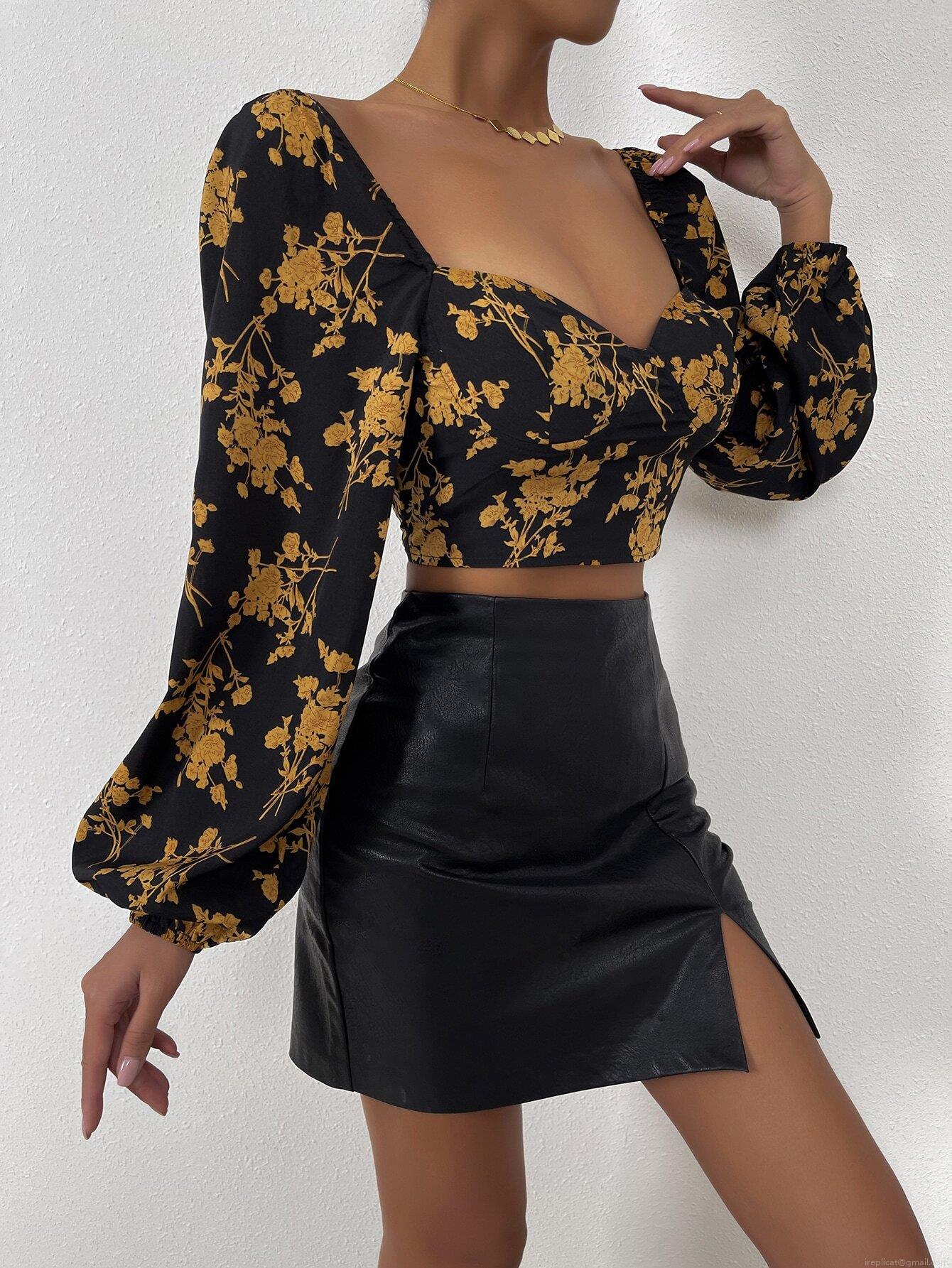 Floral Pattern, Plants And Flowers, Navel Exposed, Puff Sleeves, Square Collar, Heart-shaped Neckline